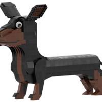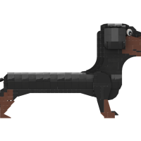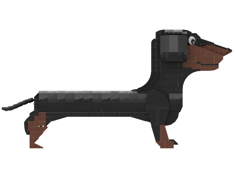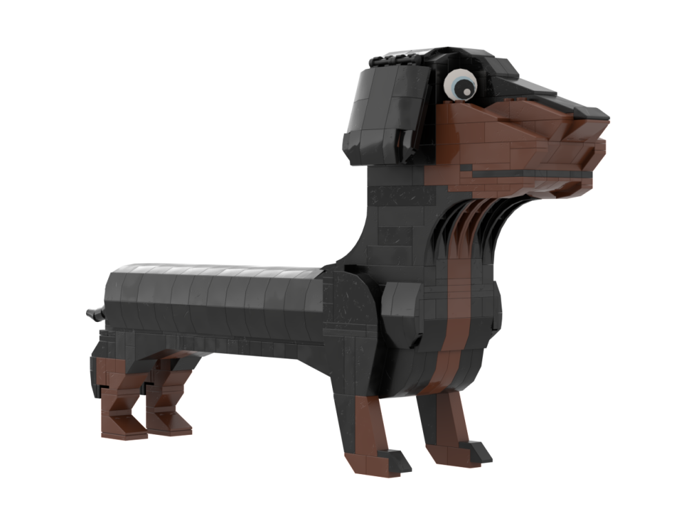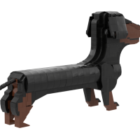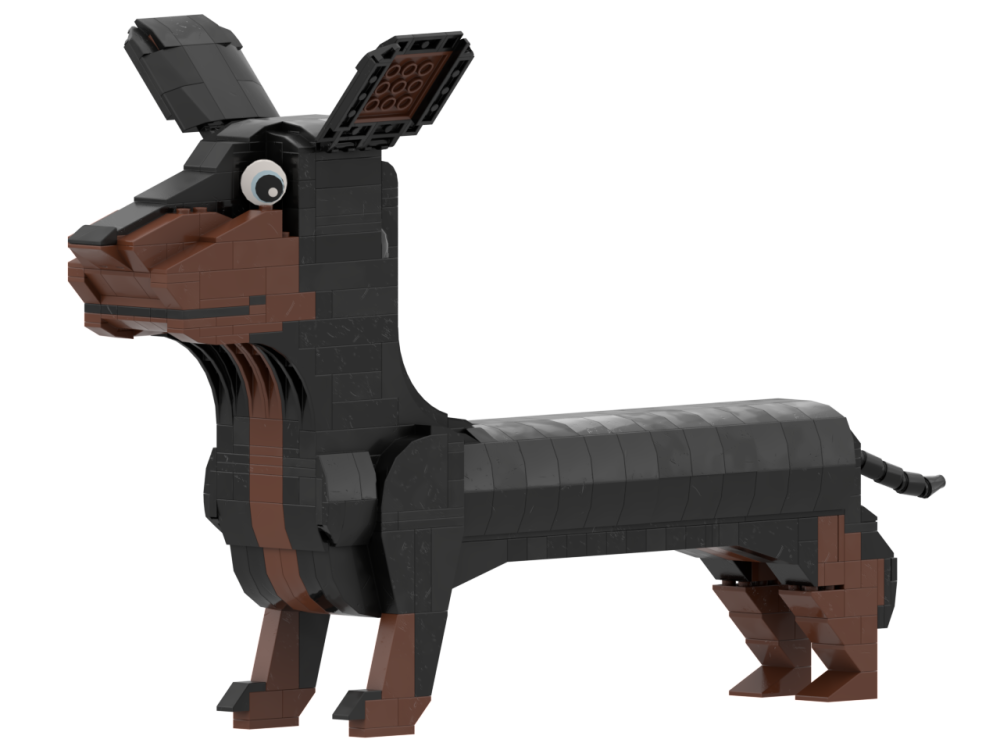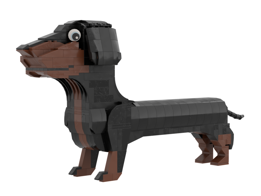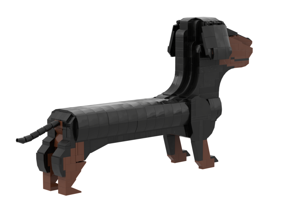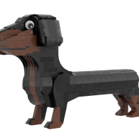 Taksikoer koosneb 690 LEGO tükkist. Tal on liikuvad kõrvad ja saba. Minu mudel on inspireeritud siledakarvalisest taksist musta ja pruuni karvaga.