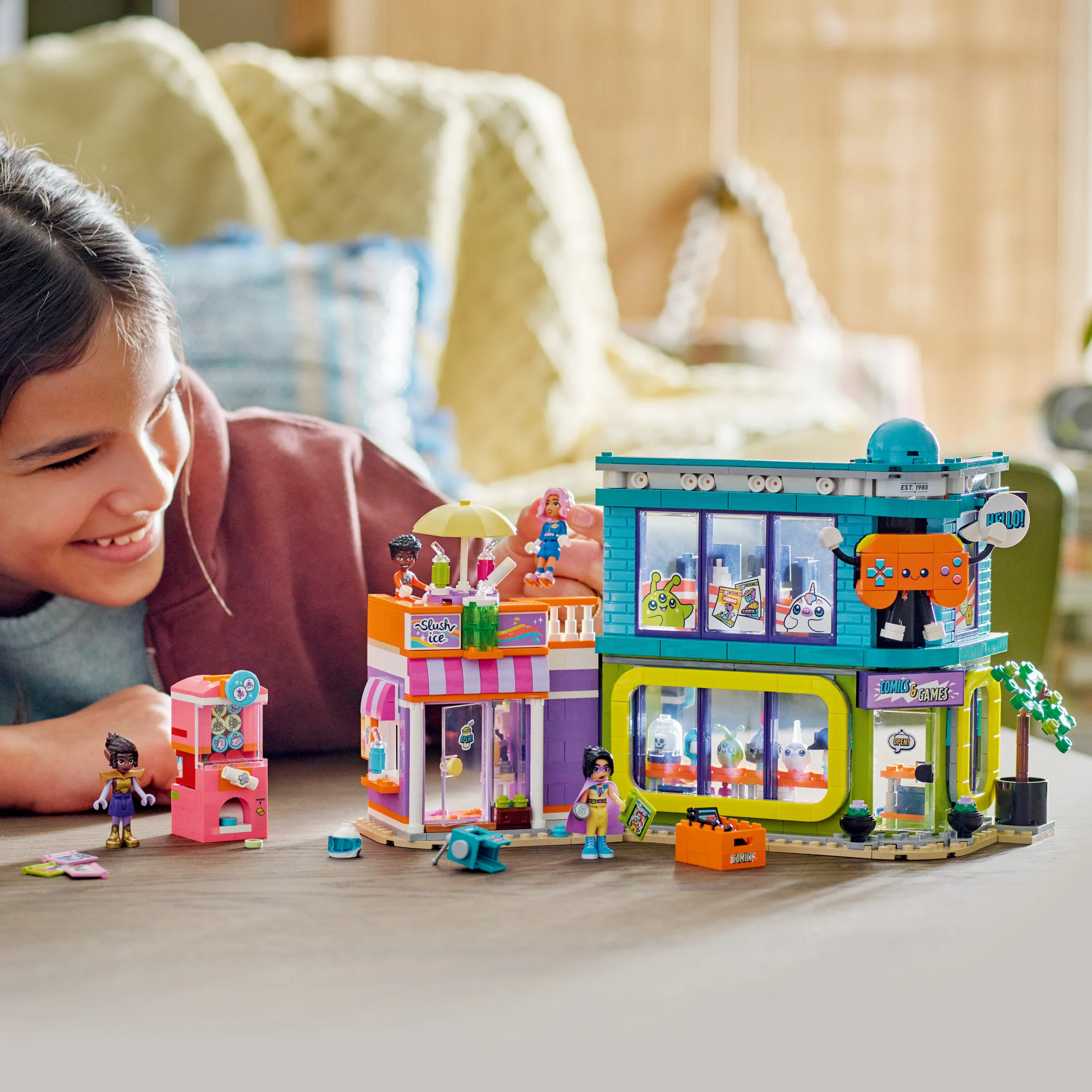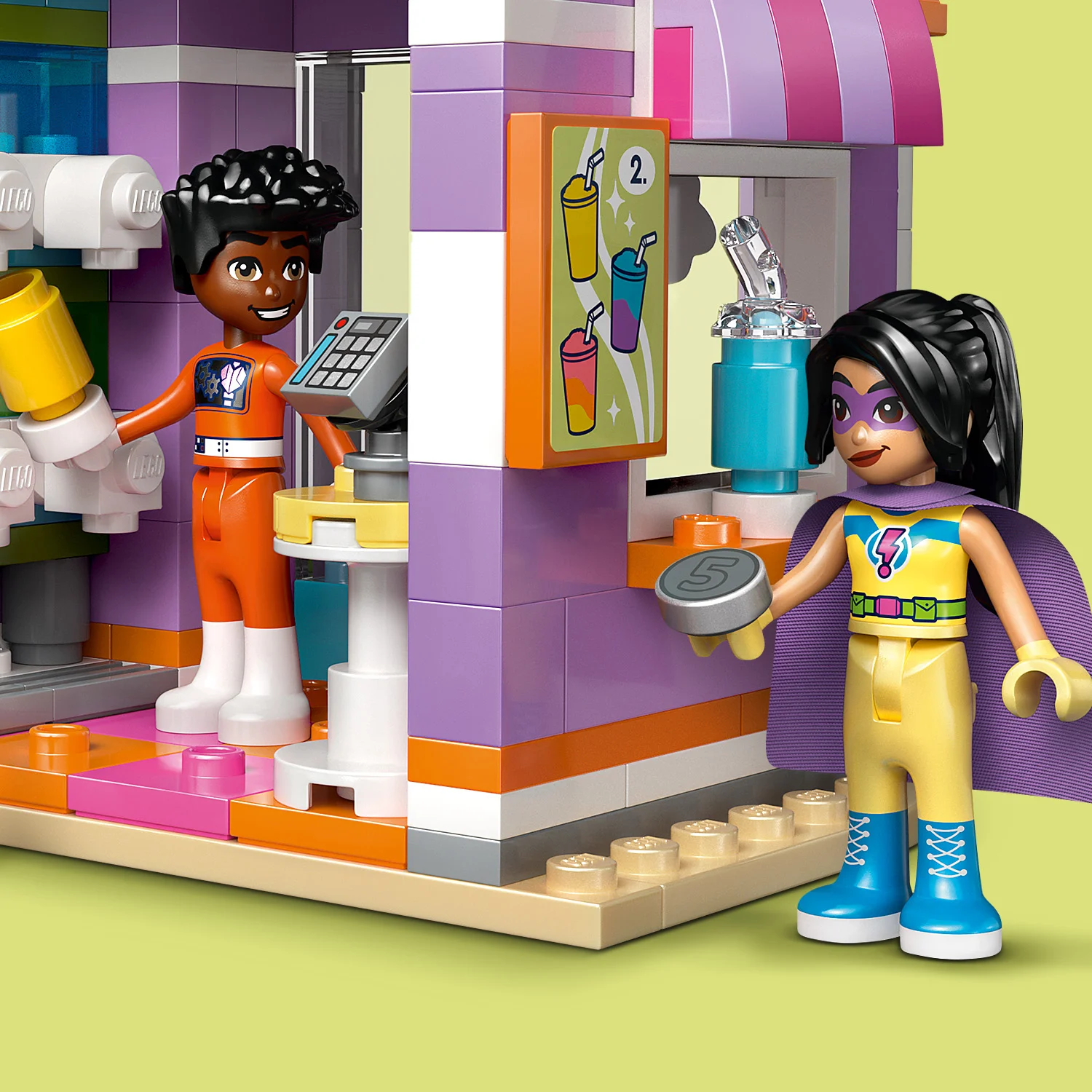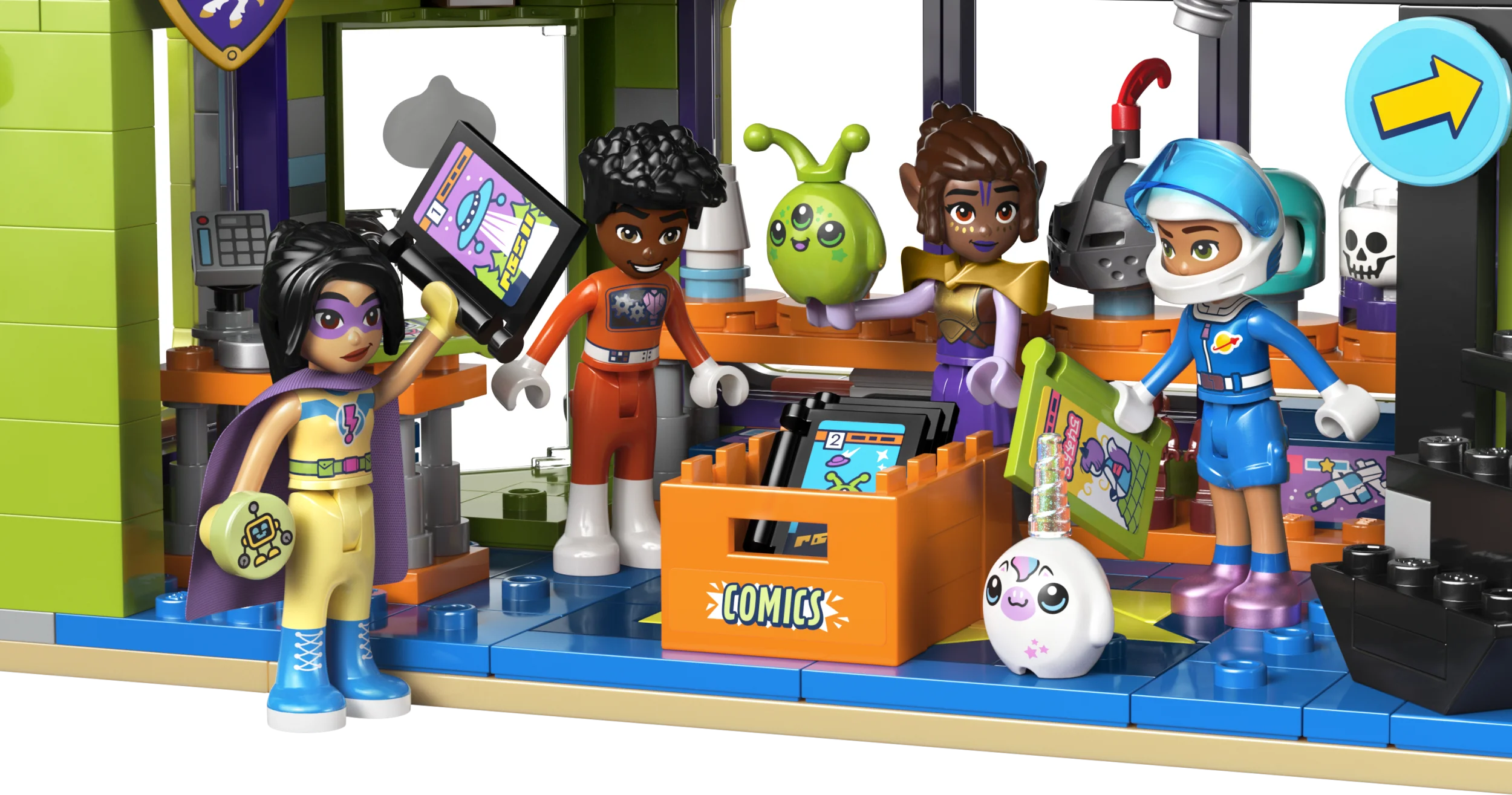 Lapsed saavad etendada palju seiklusi sõprade Zaci, Nova, Lianni ja Aliyaga, kes kannavad oma vahvat roboti, superkangelase, galaktikauurija ja rüütli kostüüme. Avasta poe pehmed mänguasjad ja mänguautomaat, mis annab välja armsaid väikseid LEGO detaile. Ülakorrusel on ruum, kus tegelased saavad mängida arvutimänge, enne kui haaravad kõrvalasuvast jäätisepoest maiuse.