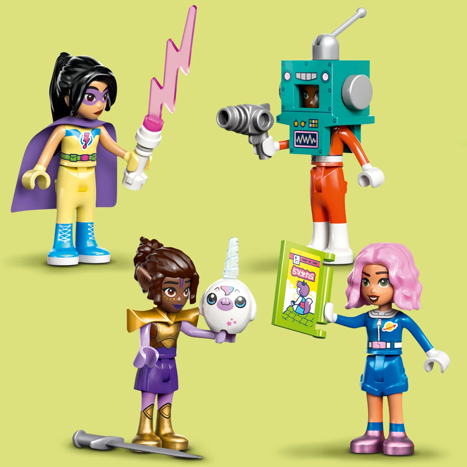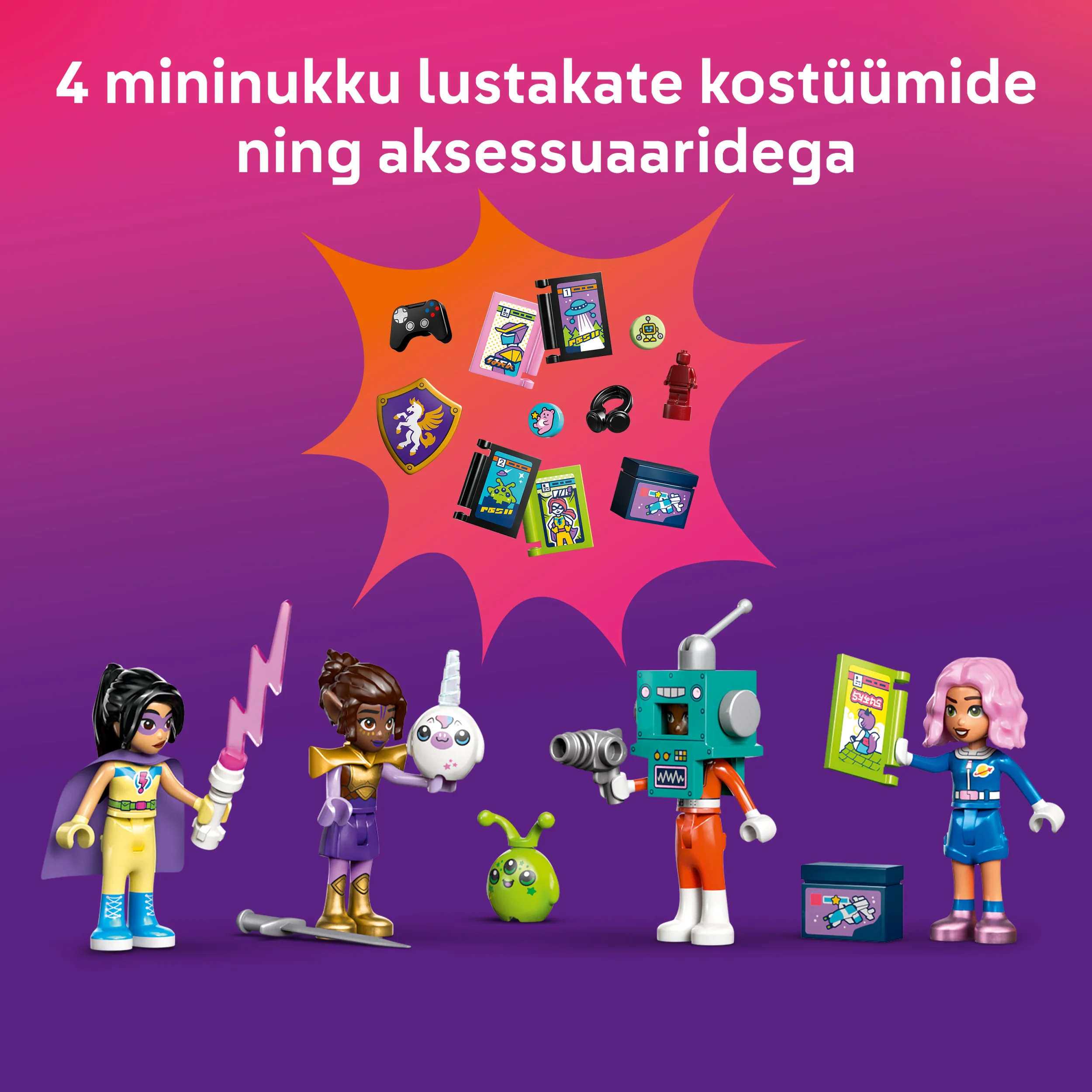 - Komplektis on 4 mininukku – tegelastel on kaasas spetsiaalsed koomiksitest inspireeritud kostüümid, sealhulgas robot, superkangelane, galaktikauurija ja rüütel, lisaks tarvikud loovmängu ergutamiseks