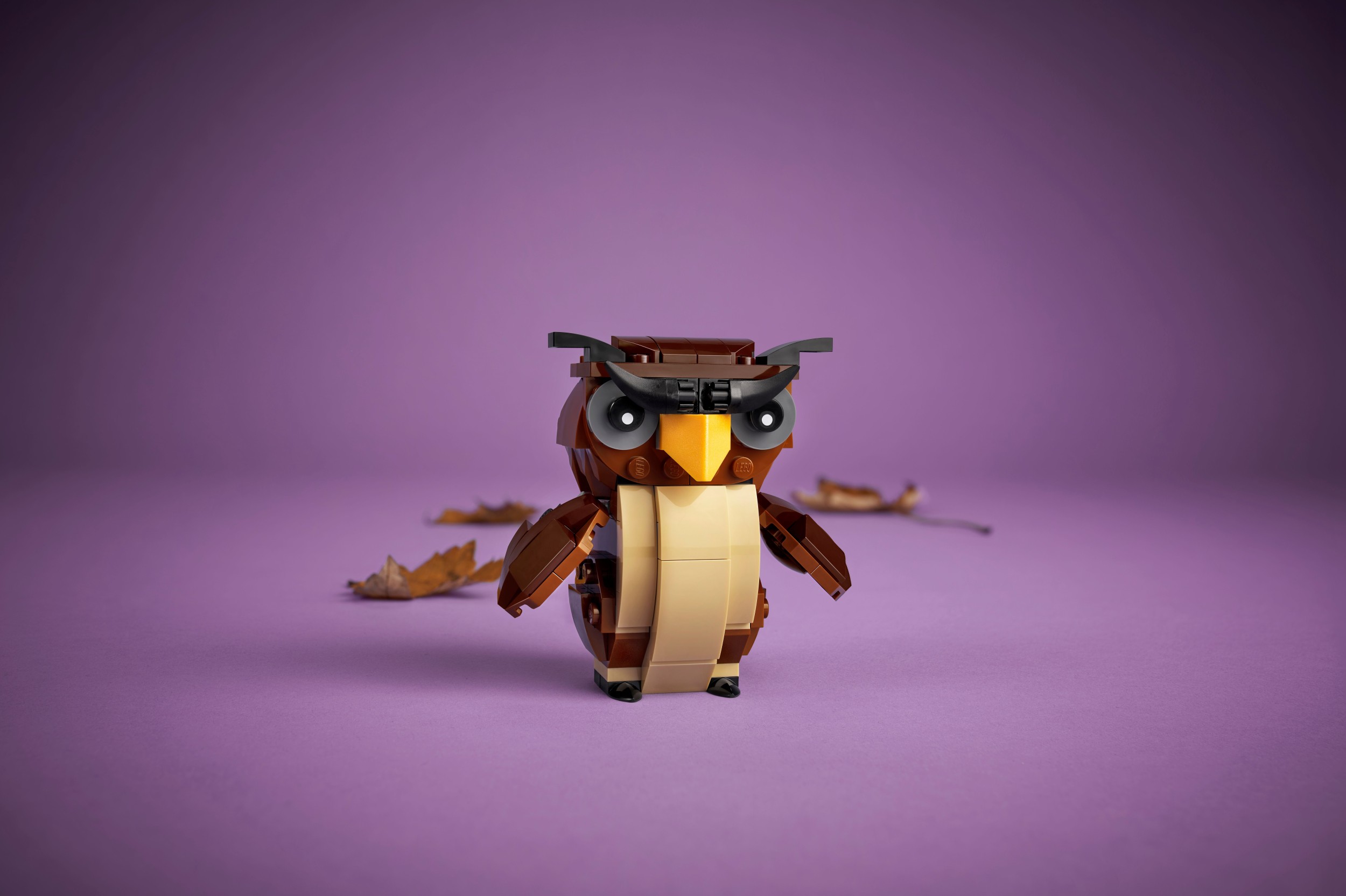 LEGO® fännid saavad halloweeni nautida selle fantastilise kaku ehitus- ja mängukomplektiga. Seda suurte silmadega armsat lindu saab pöörata ning selle tiibu saab liigutada. See seisab kahe halloweeni kõrvitsa ja ilusate sügislillede kõrval alusplaadil.