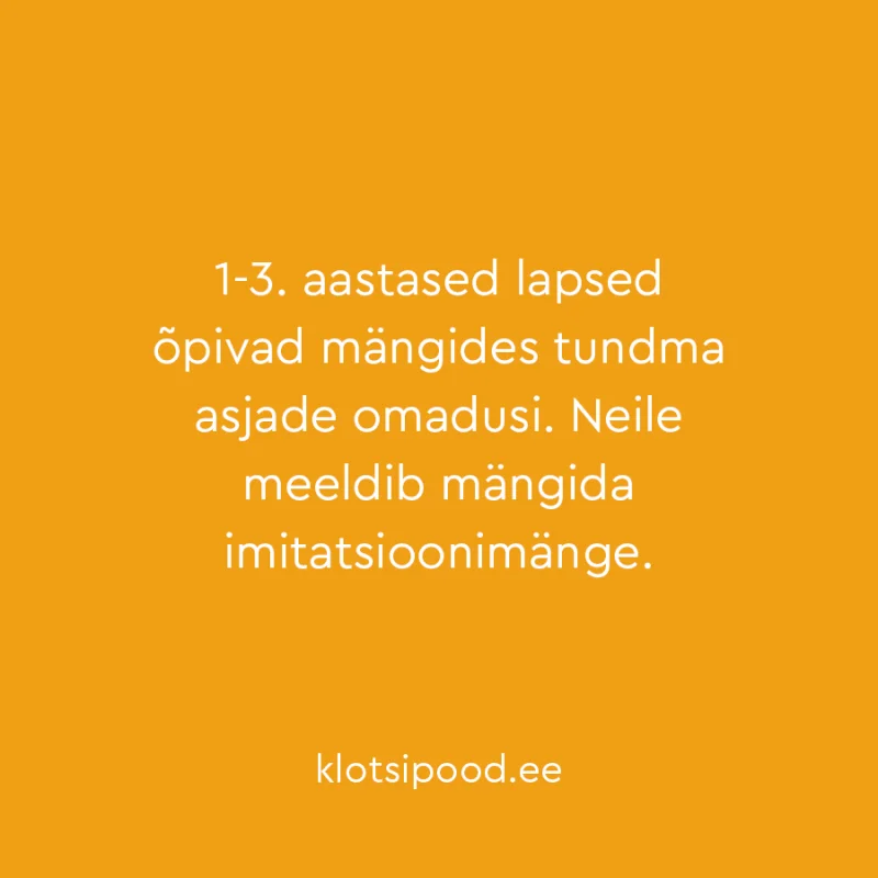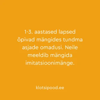 1–3-aastased lapsed õpivad mängides tundma maailma põhiomadusi – värve, kujundeid, loomi ja helisid. Selles vanuses on populaarsed imitatsioonimängud ning näiteks suuremate klotsidega mängimine, mis aitab arendada tunnetust ja lihtsamat loogikat.