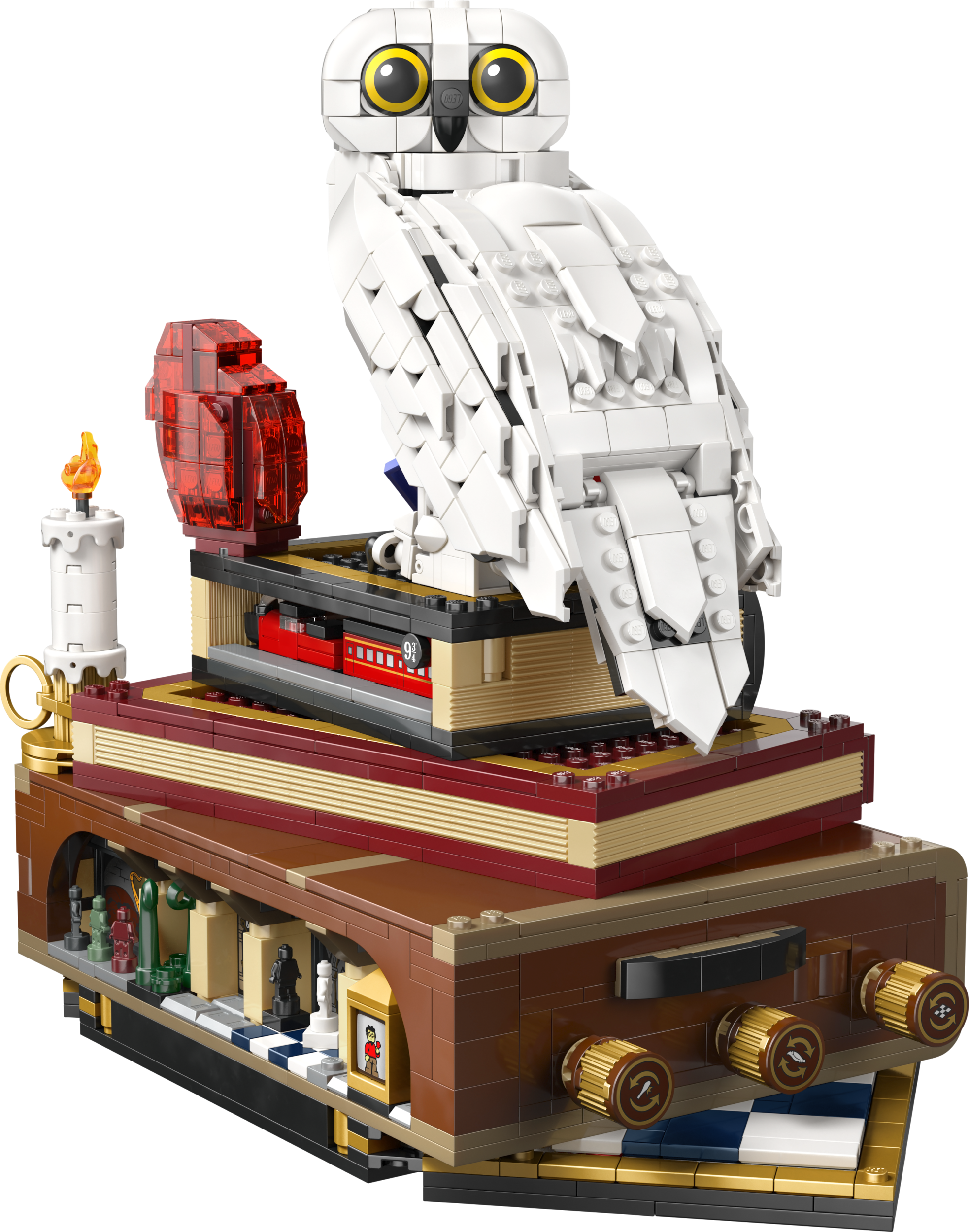 Rakenna siivet supussa istuva LEGO Hedwig™ tunturipöllöhahmo ja aseta se esille viisasten kiven viereen Harry Potterin kirstun päälle. Lisää sommitelmaan 3 LEGO Harry Potter minihahmoa – Harry Potter, Hermione Granger™ ja ™ Ron Weasley™ – sekä suklaasammakkokortti, velhoshakkilauta ja muita esineitä.