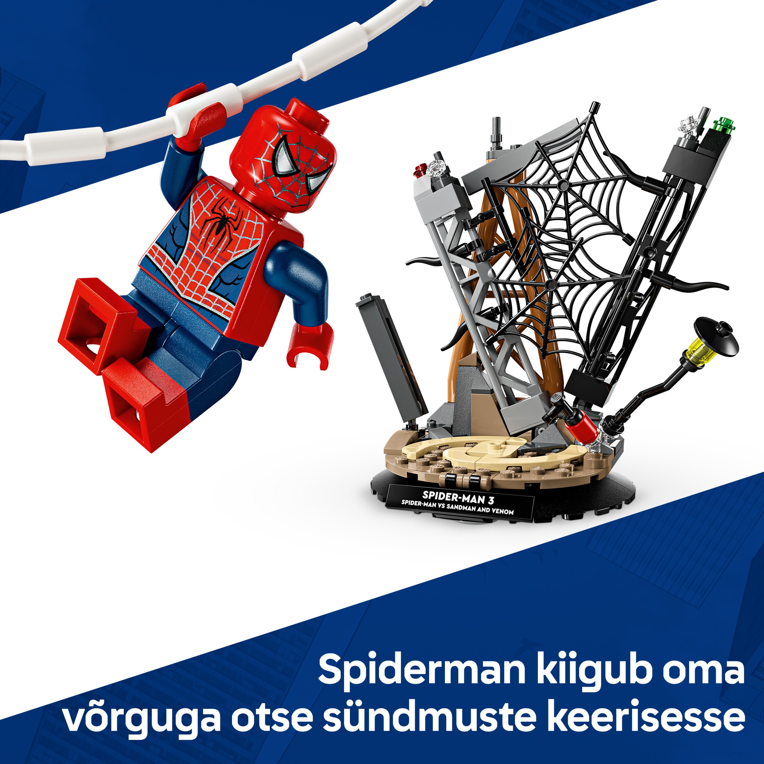 LEGO® ǀ Marvel Eeppinen taistelu: Spider-Man vastaan Sandman (76334) rakennussetin parissa 9 vuotta täyttäneet pojat ja tytöt voivat leikkiä kohtauksia Marvel Studiosin Spider-Man 3 ‑elokuvasta. Setti sisältää 3 tuttua minihahmoa – Spider-Manin, Venomin ja Sandmanin – jotka ovat omiaan niin huikeisiin seikkailuleikkeihin kuin sisustusesineiksikin.
