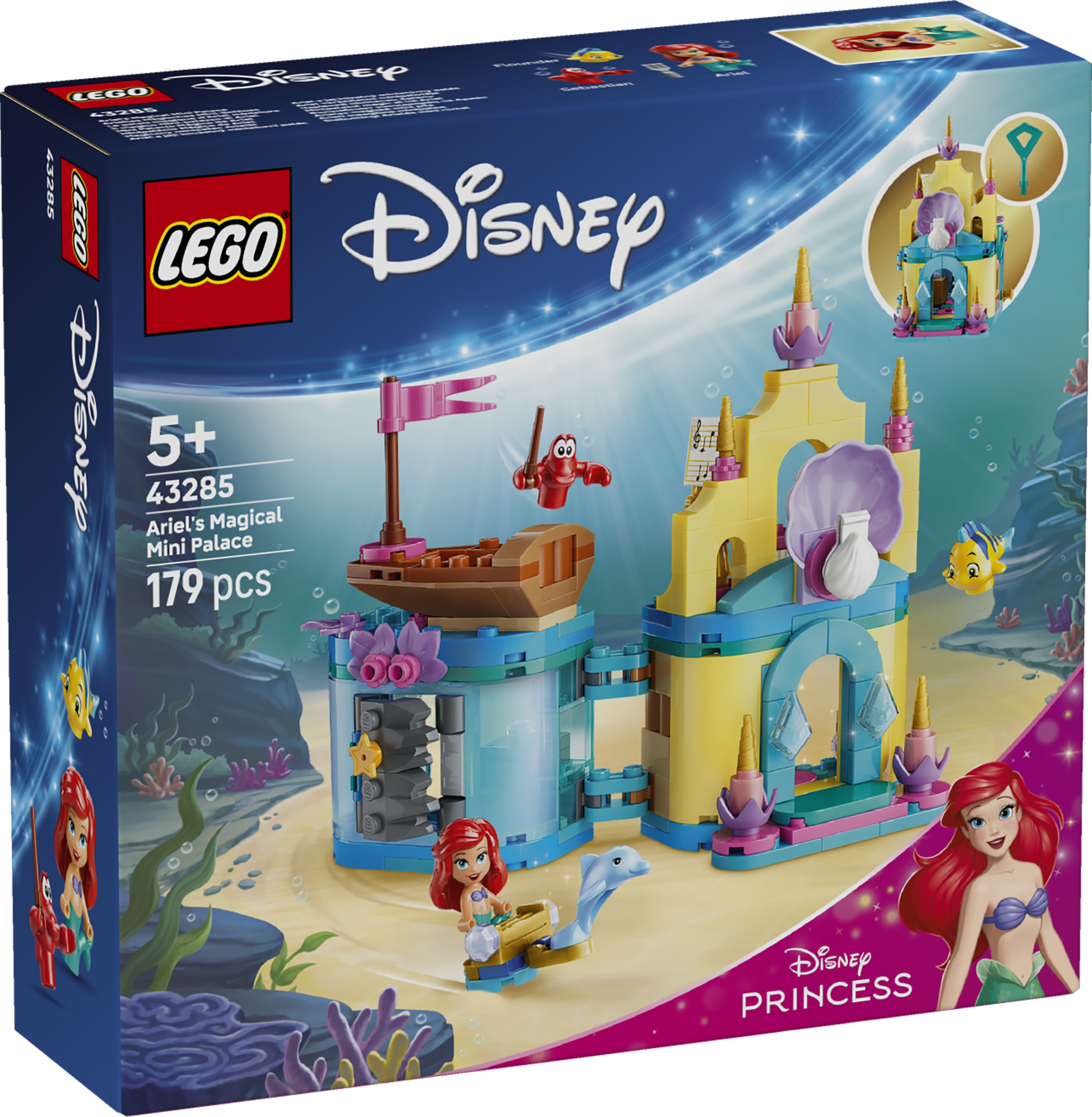Bērni var izpausties radoši šajā fantāzijas būvēšanas komplektā LEGO® ǀ Disney Princess Arielas maģiskā mini pils (43285) Disney filmas Mazā nāriņa faniem no 5 gadu vecuma. Būvējamais mikropasaules modelis ir neliela rotaļlieta ar veselu pasauli gan tajā, gan ārpus tā. Šī LEGO būvēšanas rotaļlieta meitenēm un zēniem ietver 3 LEGO ǀ Disney tēlus – Arielu, Plunkšķi un Sebastianu – un mini pili un grotu, ko var aizvērt un aizslēgt ar atslēgu, nelielu laivu un citas lietas. Pārnēsājamā mikromēroga pils ir radīta rotaļām ceļā.