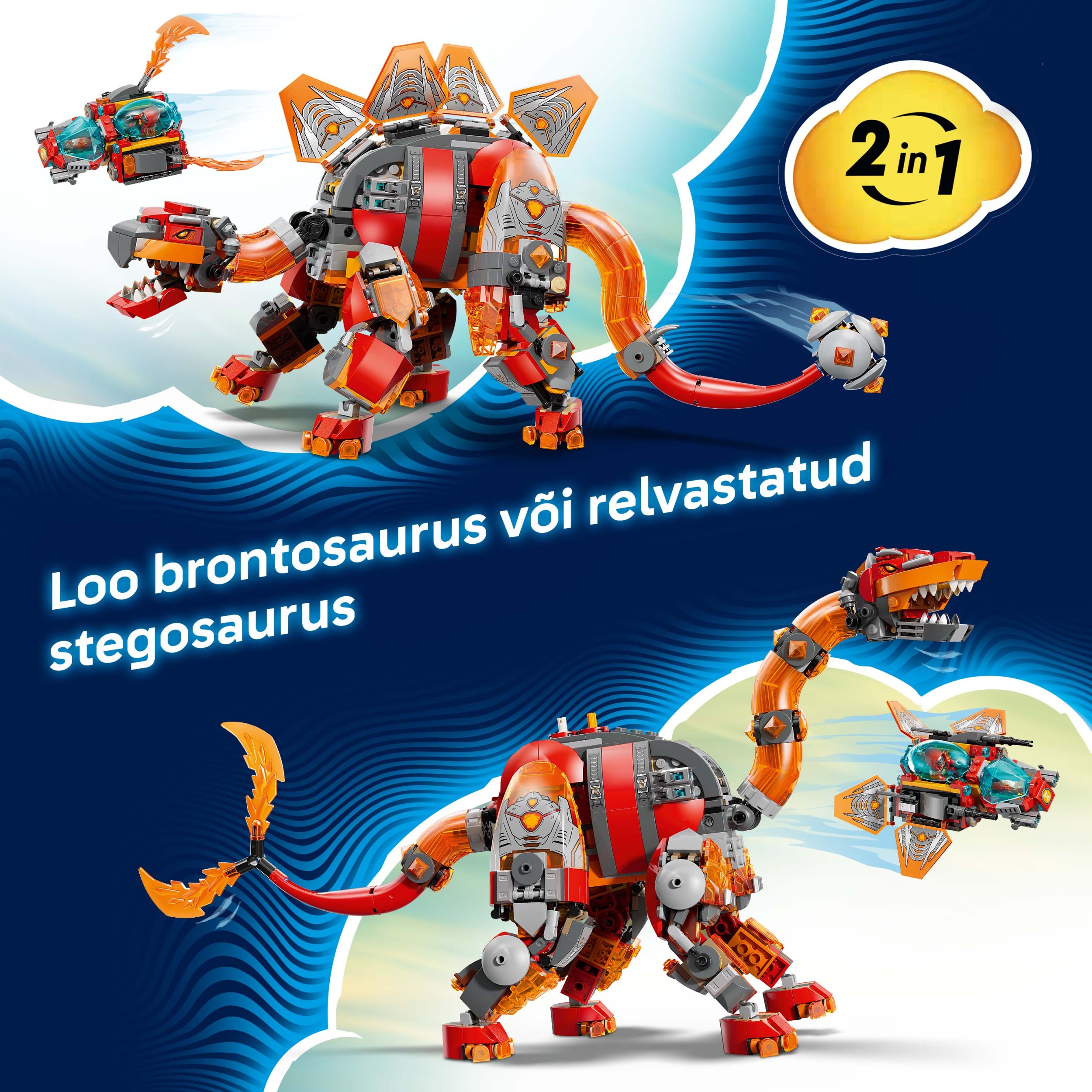 - DIVI BŪVĒŠANAS VARIANTI VIENĀ. Bērni var uzbūvēt lavā dzimušu brontozauru ar dubultu asti vai bruņotu stegozauru ar liesmojošu astes galu, un katram no tiem ir kosmosa kuģis