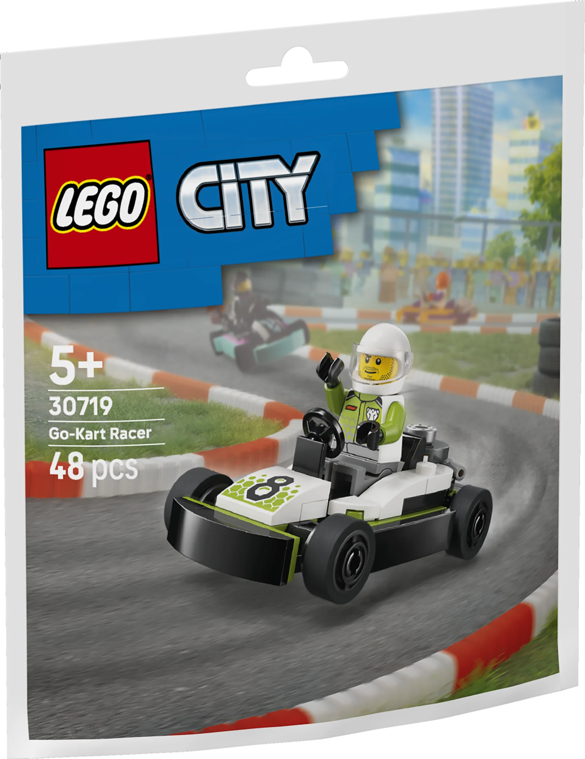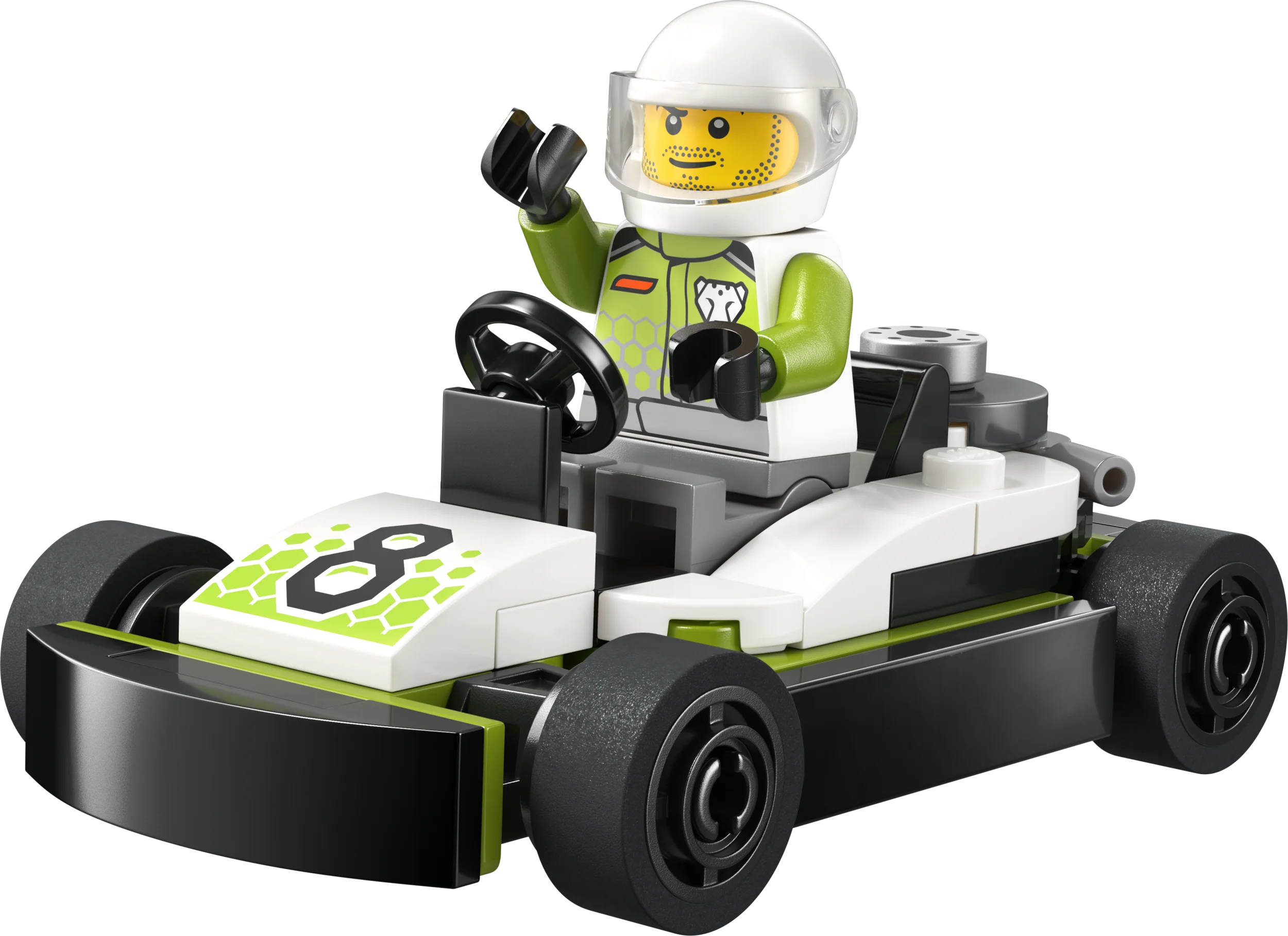 Rosini dinamiskas un radošas rotaļas ar LEGO® Kartinga sacīkšu braucēju, kas ietver zema profila sacīkšu auto ar gludām riepām un vadītāja minifigūru.