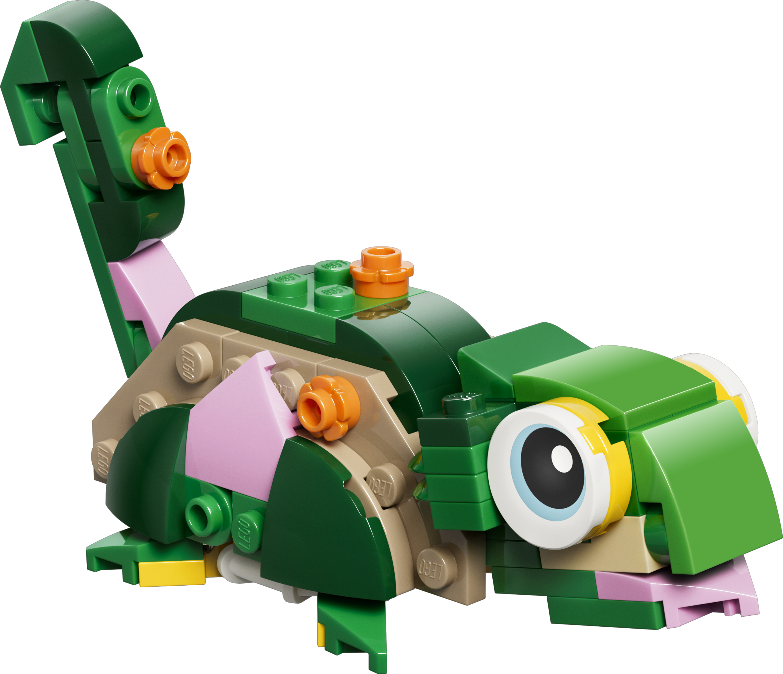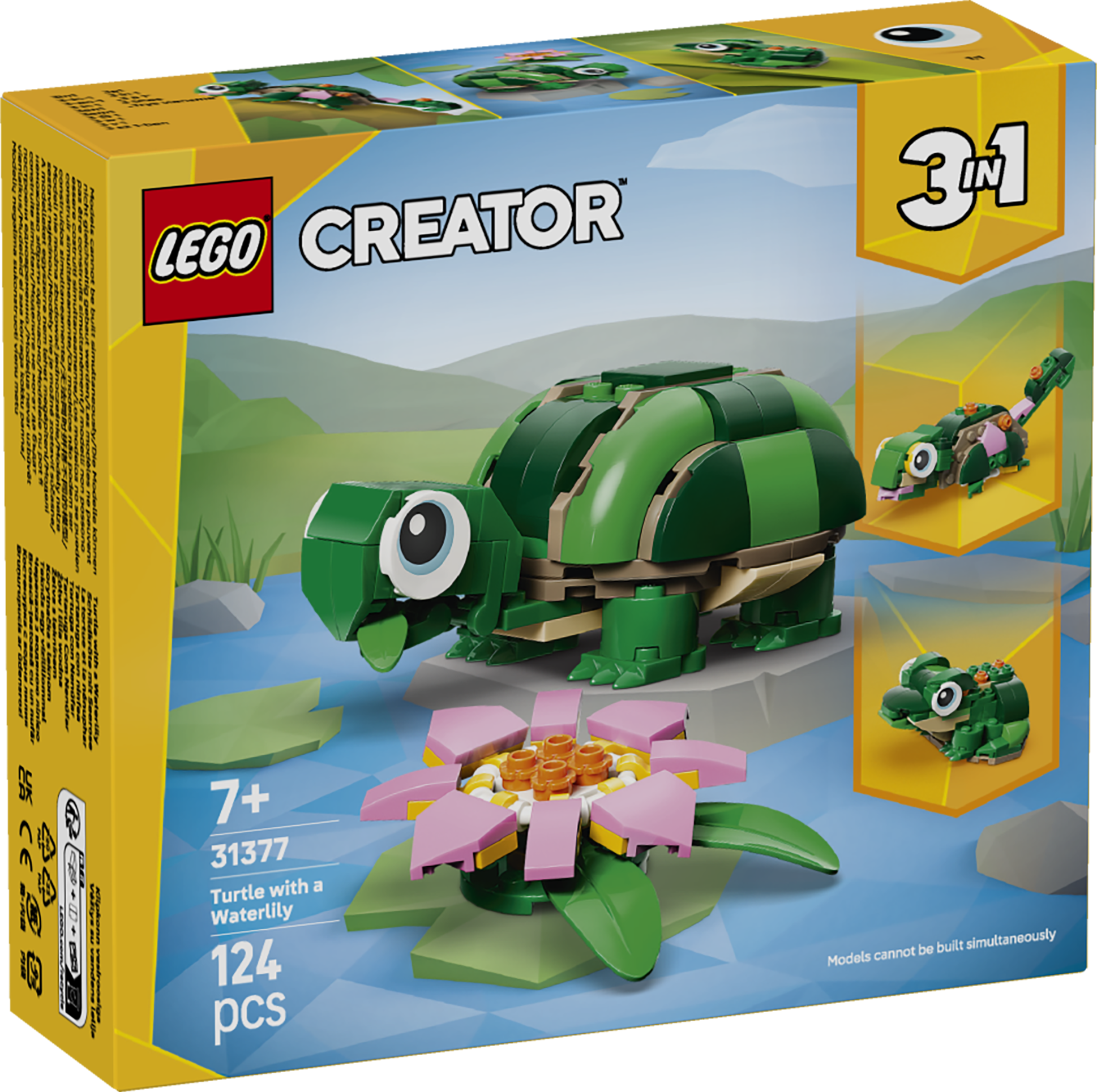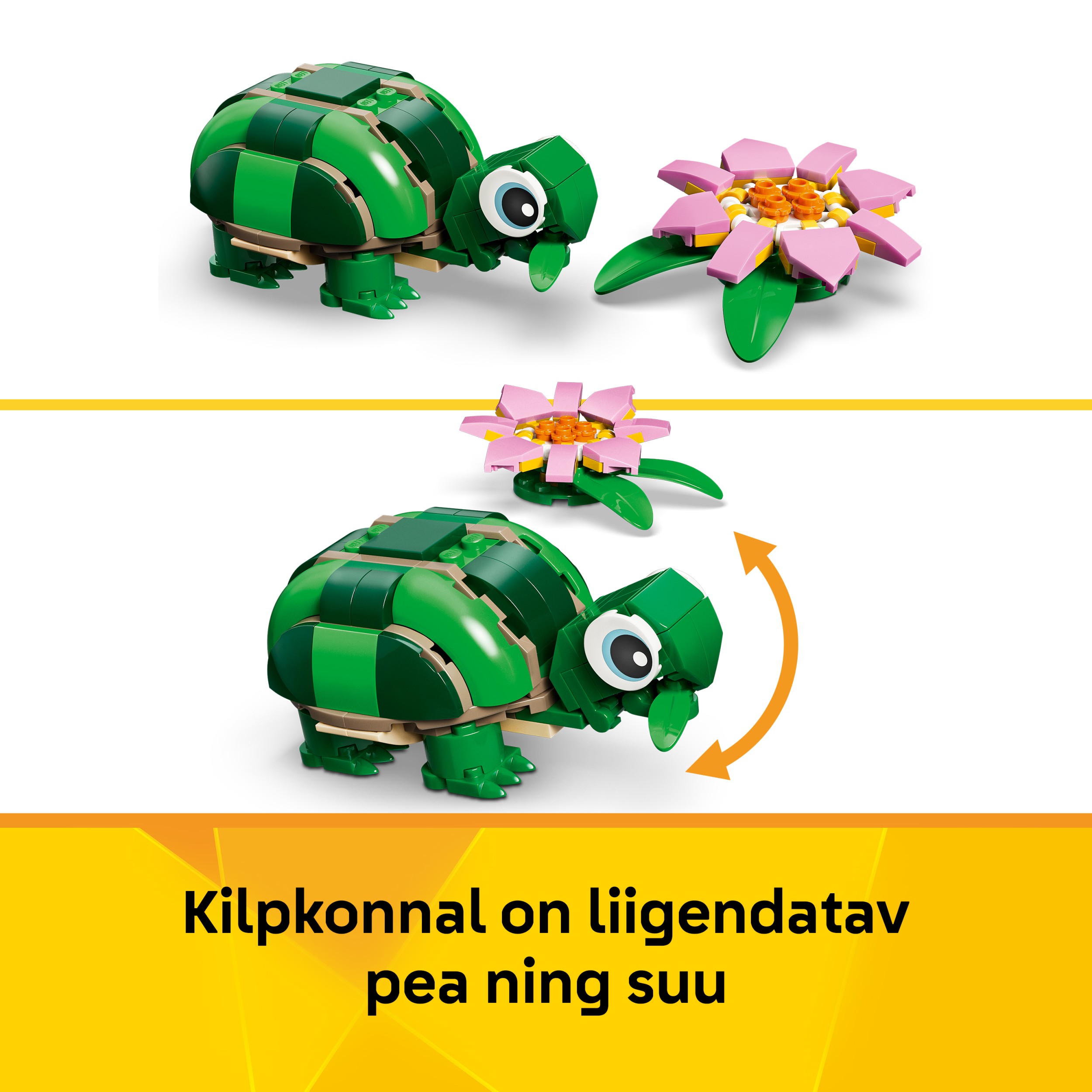 - "TRĪS VIENĀ" ROTAĻU DZĪVNIEKI BĒRNIEM. LEGO® Creator Bruņurupucis ar ūdensrozes ziedu (31377) ļauj meitenēm un zēniem no 7 gadu vecuma uzbūvēt un pārbūvēt trīs mīlīgas dzīvnieku figūras no vieniem un tiem pašiem klucīšiem