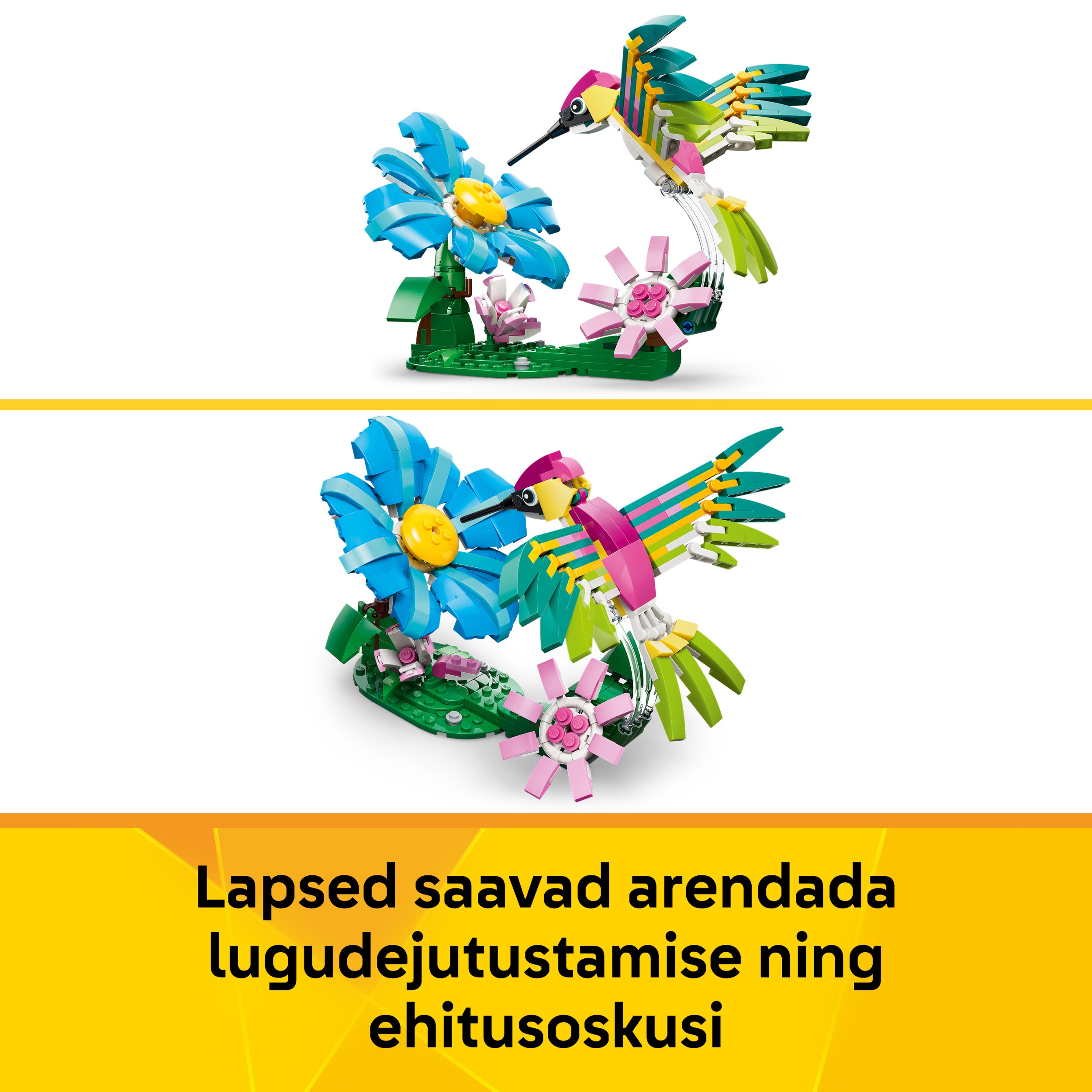 Meitenes un zēni no 8 gadu vecuma, kam patīk dzīvnieki, var izspēlēt burvīgus stāstus ar būvējamo rotaļlietu LEGO® Creator "Trīs vienā" Savvaļas dzīvnieki: Krāsainais kolibri (31384). Šis iespaidīgais dzīvnieku figūru komplekts bērniem piedāvā 3 dažādus būvēšanas variantus ar vieniem un tiem pašiem klucīšiem.
