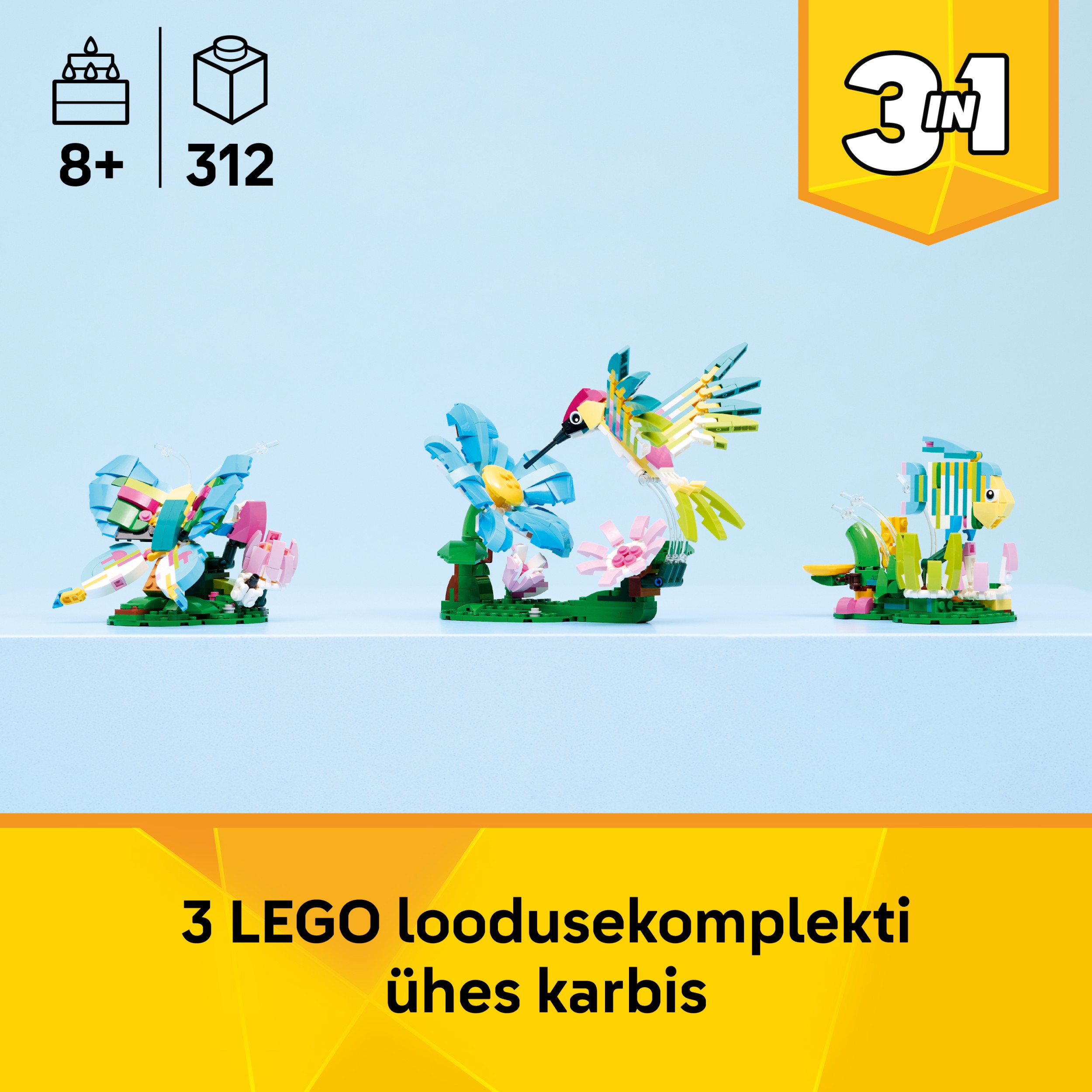 - "Trīs vienā" DEKORS PAR DABAS TEMATIKU. LEGO® Creator "Trīs vienā" Savvaļas dzīvnieki: Krāsainais kolibri (31384) ļauj bērniem no 8 gadu vecuma uzbūvēt un pārbūvēt 3 dzīvnieku figūras uz statīviem, izmantojot vienus un tos pašus klucīšus