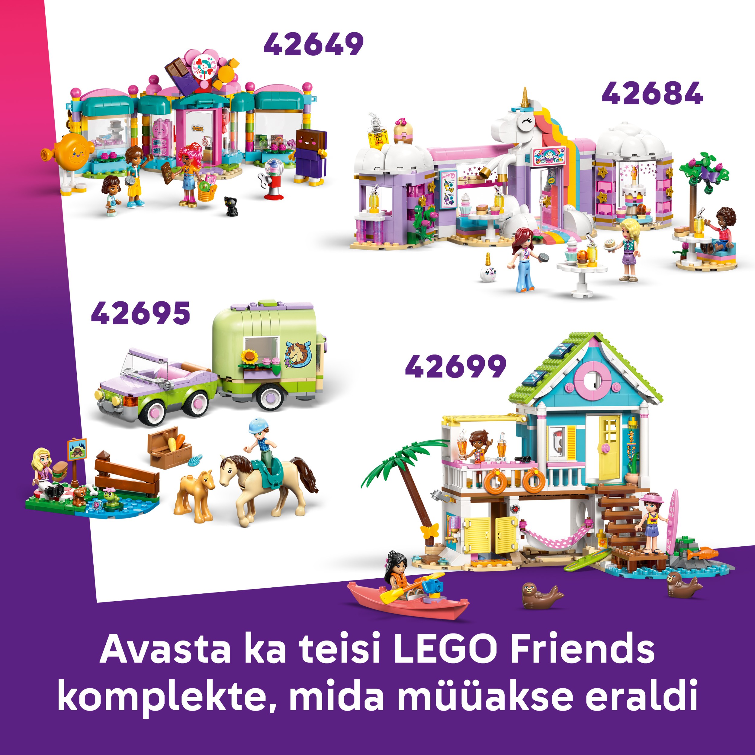 - TIEŠSAISTES ŠOVS. Atklāj vairāk radošu rotaļu ideju ar citiem komplektiem (jāiegādājas atsevišķi) un tiešsaistes šovu LEGO® Friends: The Next Chapter, kur bērni var iepazīt Hārtleikas pilsētas varoņus
