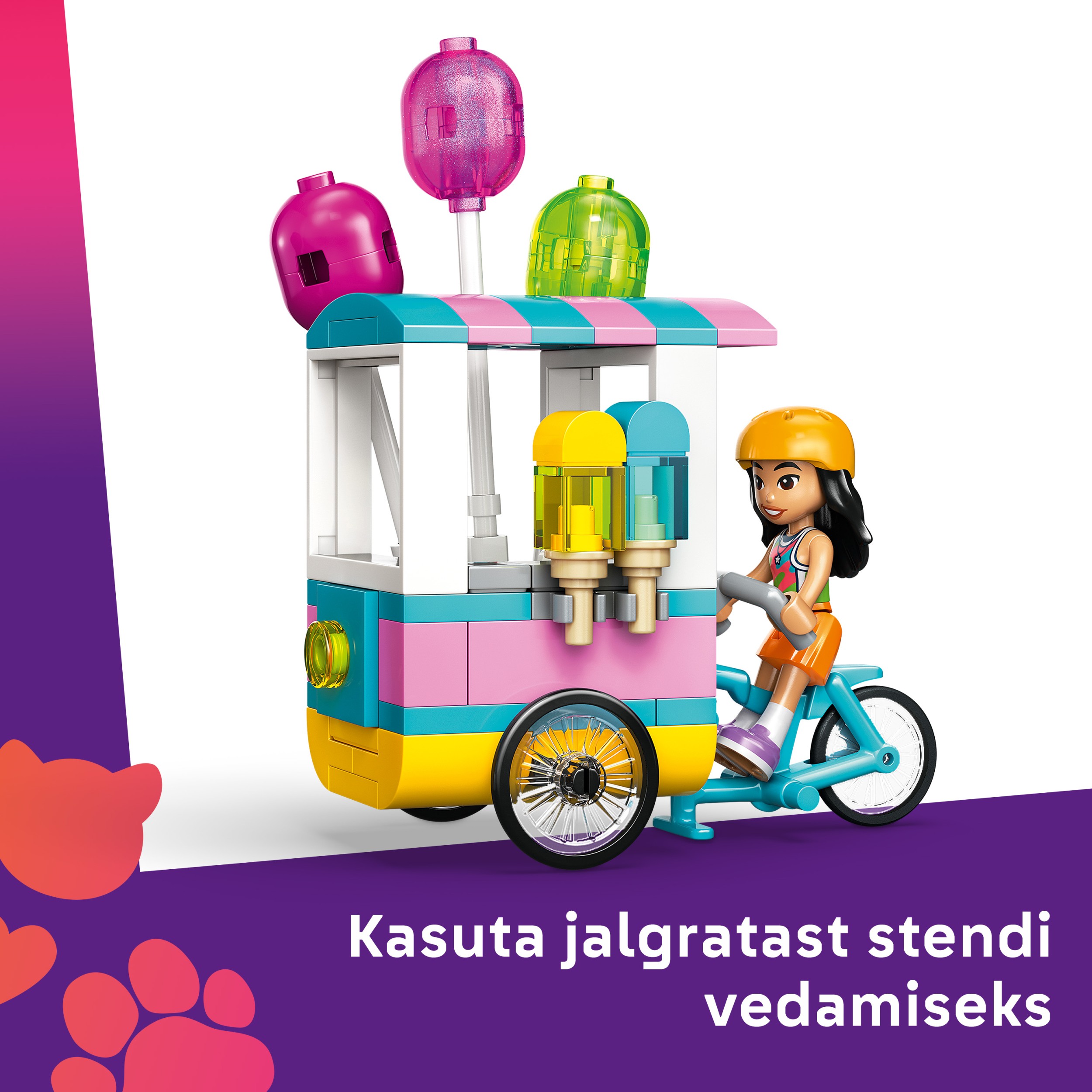 - IEJŪTIES KLIENTA LOMĀ. Rosini bērnus radīt pašiem savus stāstus, kad viņi iejūtas klientu un pārdevējas lomās ar šo aizraujošo LEGO® Friends komplektu, kurā ir ēdiena stends, velosipēds, baloni un saldējumi