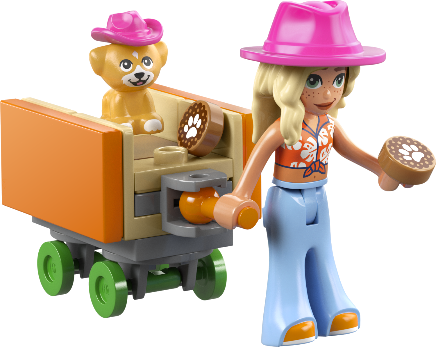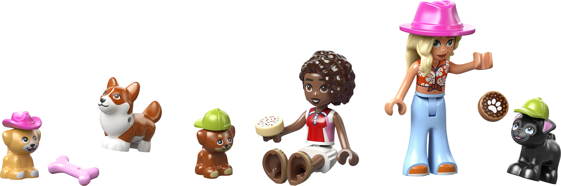 - 2 LEGO® FRIENDS PERSONĀŽI. Komplektā ir Alijas un Sage minilellītes, kā arī 4 rotaļu suņi un daudzas dzīvniekiem draudzīgas detaļas, piemēram, mājdzīvnieku durtiņas, rampa, kārumi, interesantas zīmes un mājdzīvnieku pārvadātājs