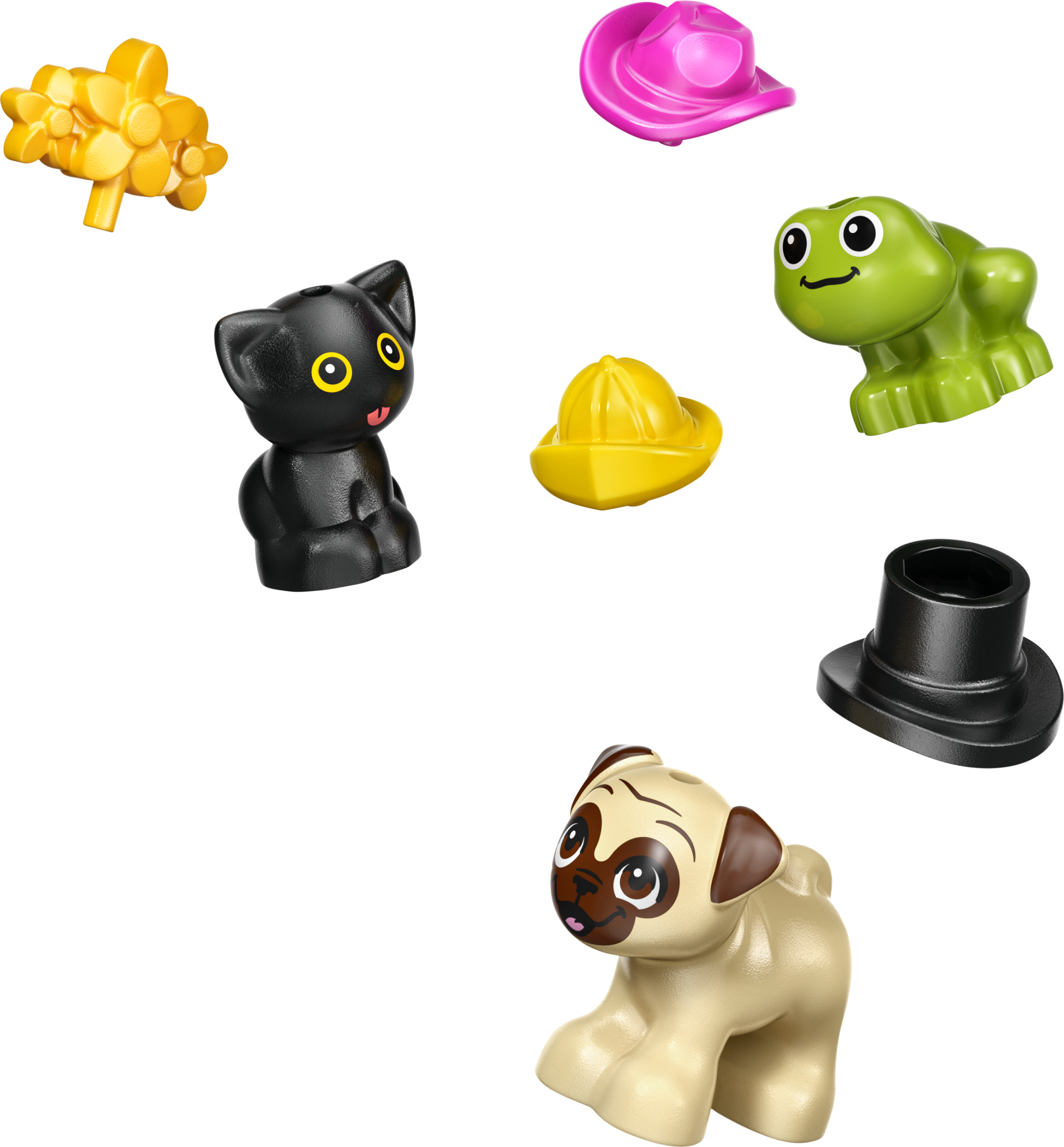 Detalizētais būvēšanas komplekts rosina brīvu rotaļāšanos ar 2 minilellītēm, kaķēna, suņa un vardes figūrām, un mīlīgiem dzīvnieku piederumiem. Šis komplekts sniedz daudz aizraujošu brīžu – apbrīno busiņu mopša formā un vēro, kā tam kustas aste! Izpaudies radoši, palīdzot mājdzīvniekiem uzlaikot dažādas cepures, tostarp lietus cepuri, kovboju cepuri, hūti un ziedu vainagu. Apskati mīlīgo talismanu – kaulu, tad piepildi busiņu ar aksesuāriem, lai būtu gatavs nākamajam piedzīvojumam.
