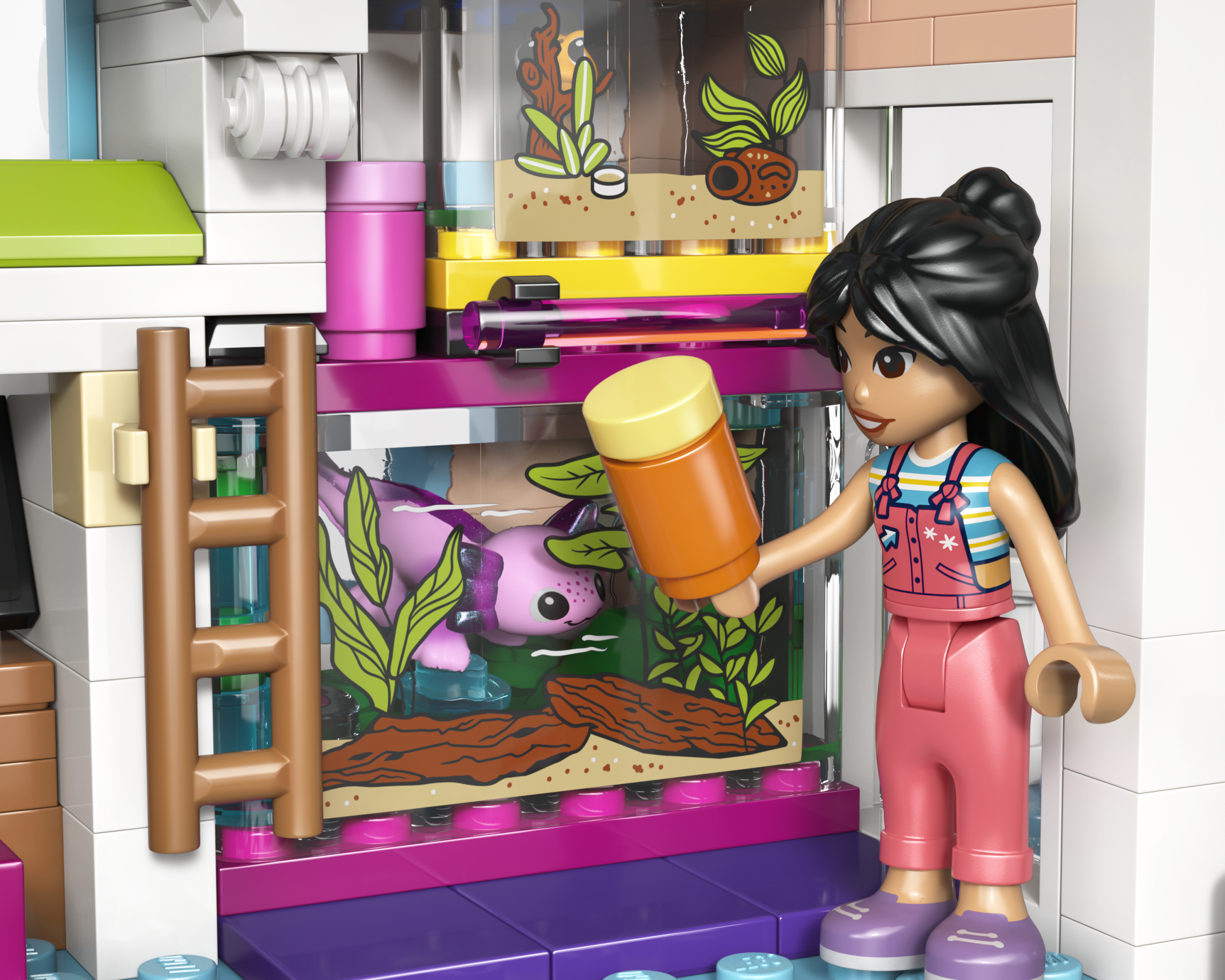 - 4 LEGO® FRIENDS PERSONĀŽI. Šajā rotaļlietā lomu spēlēm ir Liannas, Mišelas, Peislijas un Novas minifigūras, kā arī gekona un aksolotla rotaļu figūras, kam ir pašiem savi terāriji un barība
