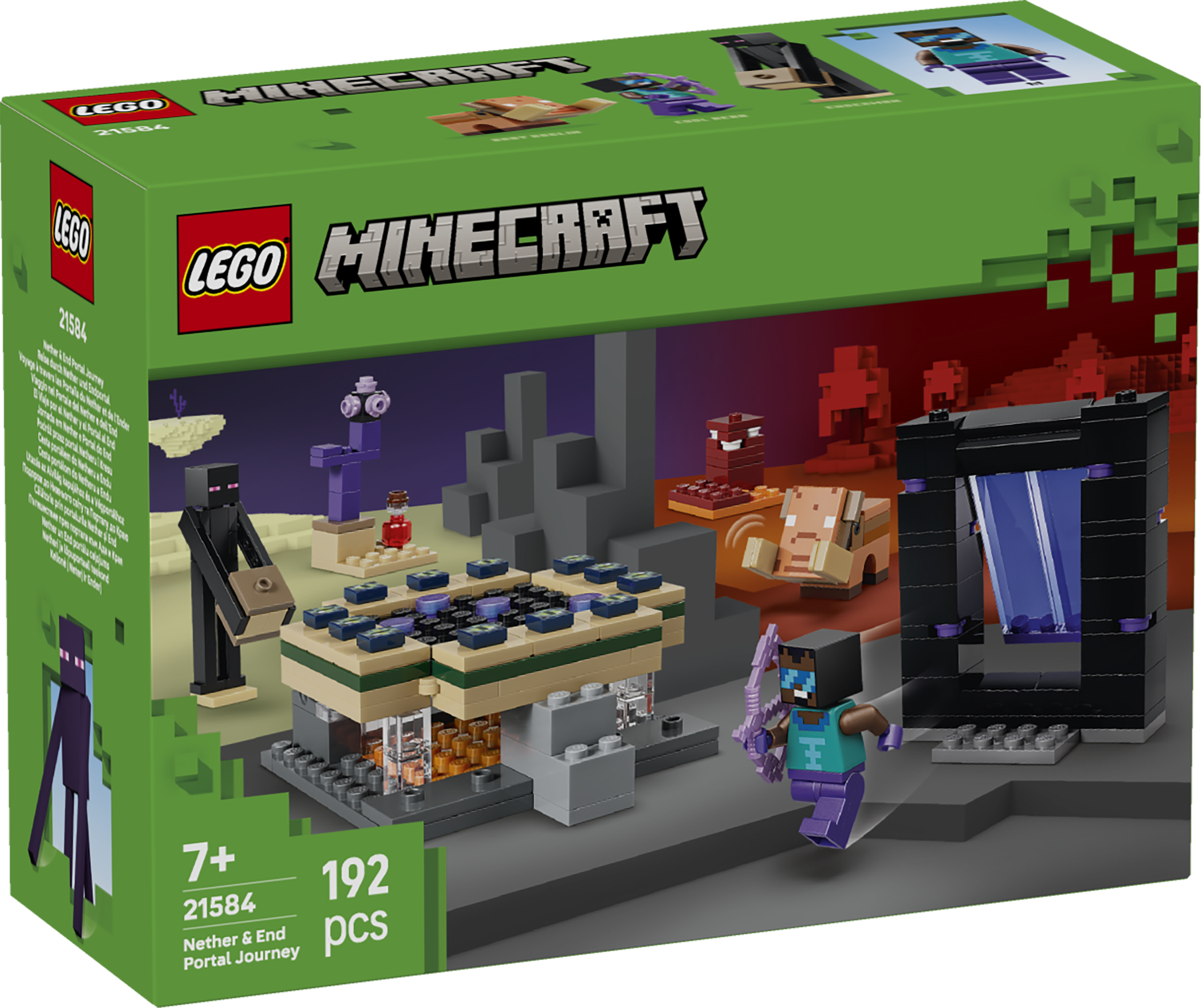 - 3 PERSONĀŽI, 2 PORTĀLI. Aktivizē rotaļlietas portālus un izej tiem cauri, lai atrastu LEGO® modeli no katras biomas un Minecraft® piedzīvojumus ar Foršā varoņa minifigūru, kā arī Enderman un Hoglin mazuļa figūras