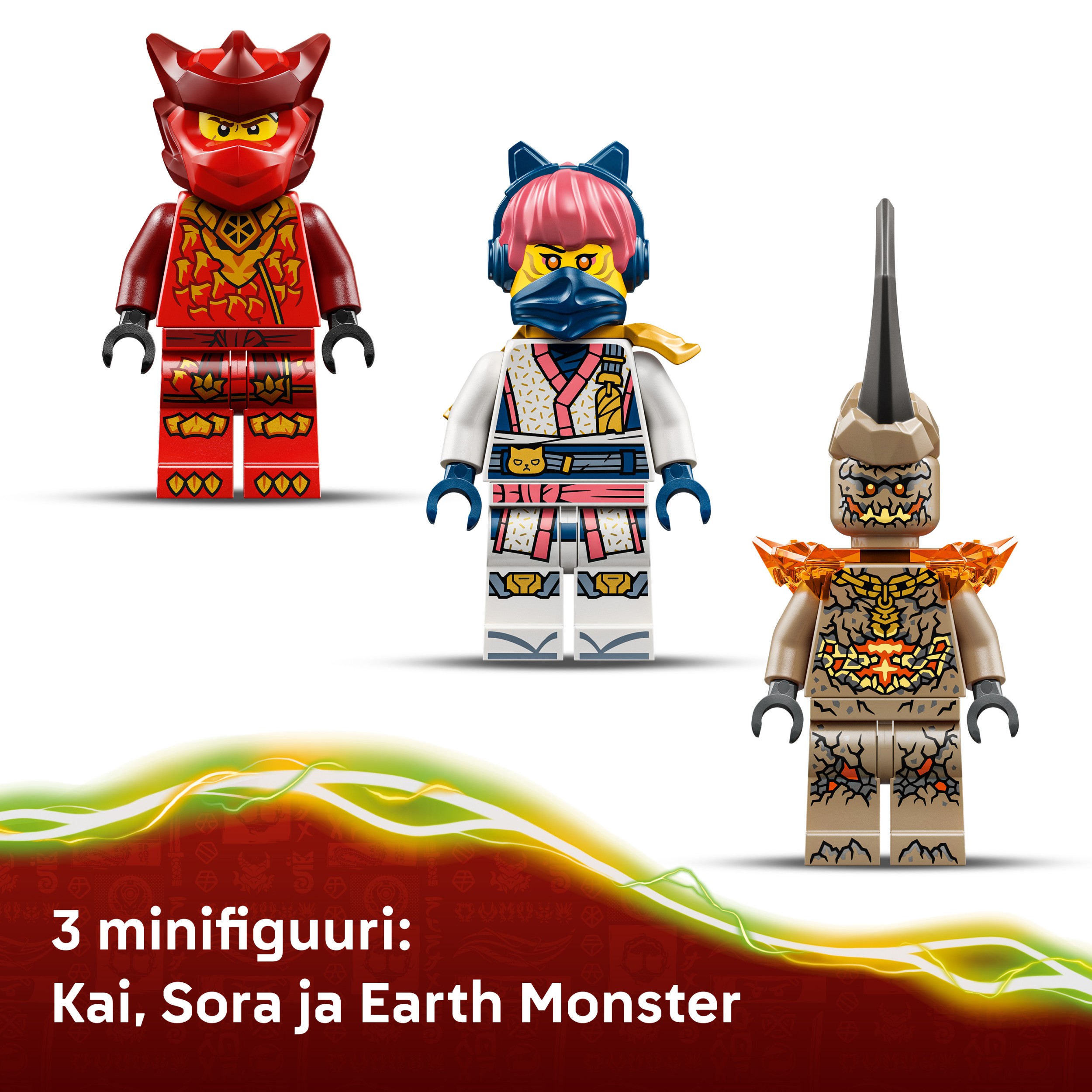 Šajā lieliskajā nindzju rotaļlietā ir arī 3 minifigūras: Kai ar 2 zobenu piederumiem, Sora ar 2 zobeniem un Zemes briesmonis ar milzu nagiem, kas ļauj bērniem stundām ilgi izspēlēt piedzīvojumus un ainas no NINJAGO Dragons Rising 4. sezonas.