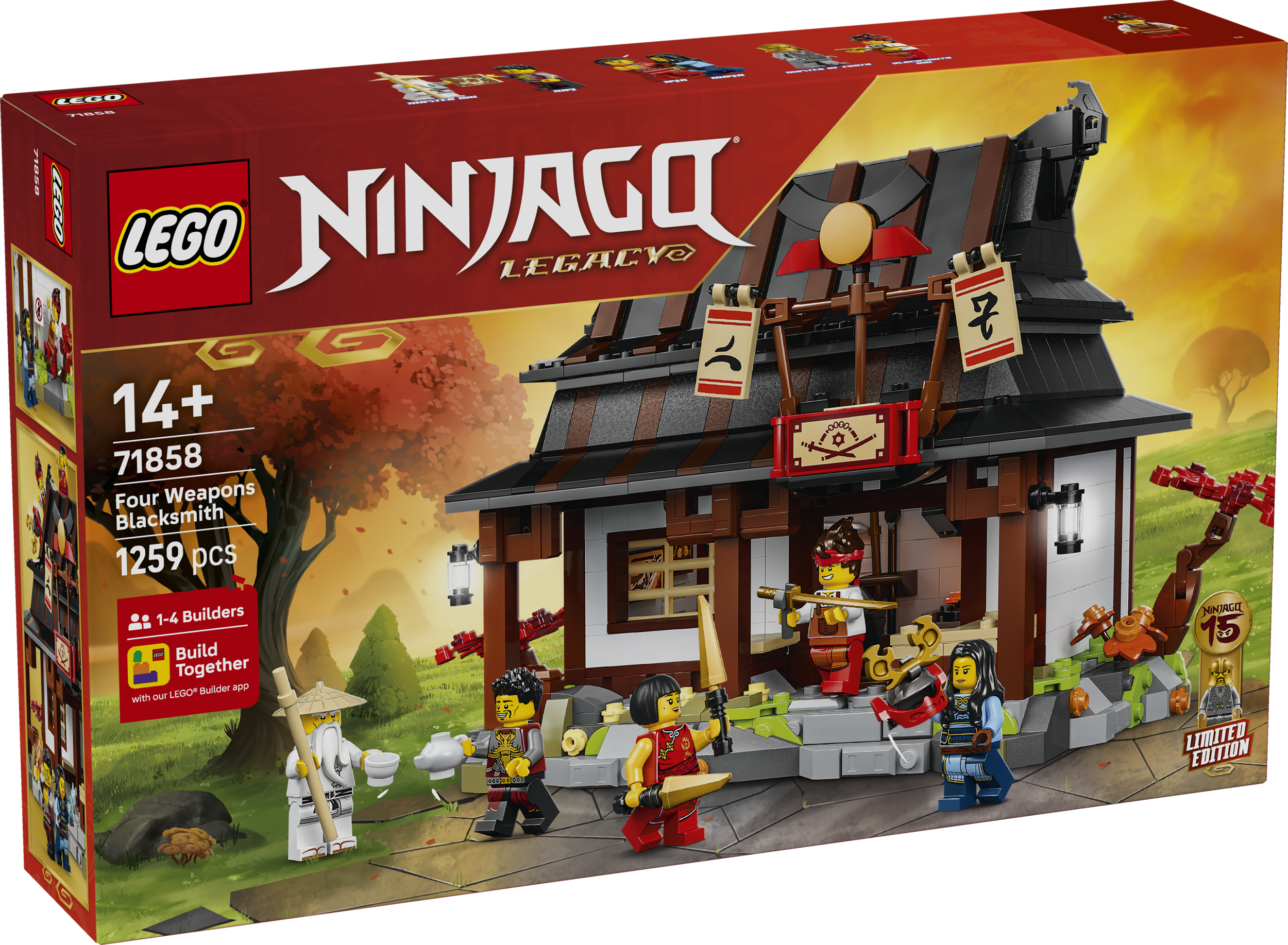 Priecājies par TV seriālu LEGO® NINJAGO® ar šo būvēšanas komplektu "Četru ieroču kalēja 15. gadadiena" (71858). Zēni, meitenes un nostalģiski fani no 14 gadu vecuma būs sajūsmā, pirmo reizi uzbūvējot, izliekot apskatei un atveidojot piedzīvojumus ar izteiksmīgo kalēja veikalu – pašu pirmo lokāciju TV seriāla LEGO NINJAGO pirmajā sērijā.