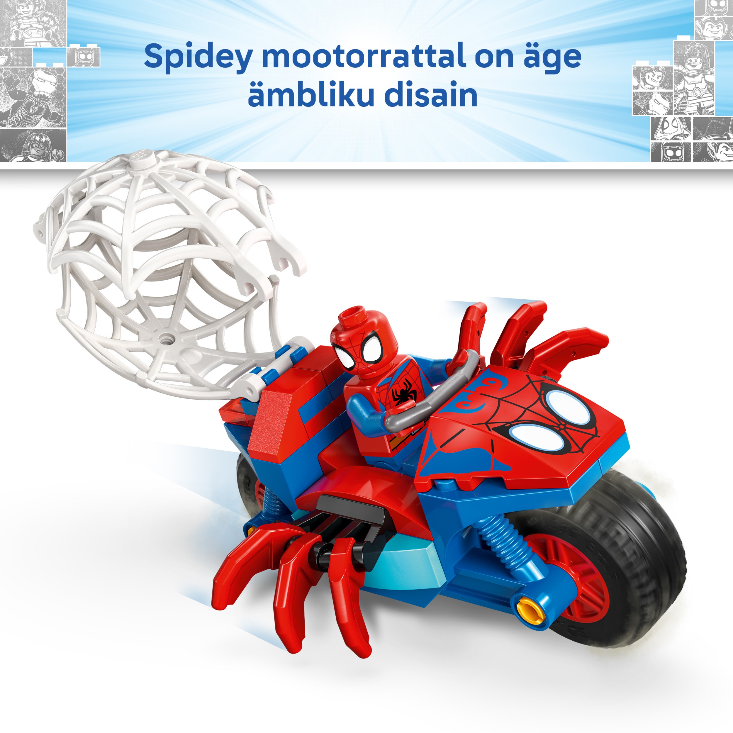 - SPIDEY UN DEGUNRADŽA MINIFIGŪRAS. Iedvesmo mazos būvētājus un Marvel fanus ar piedzīvojumiem pilnu rotaļlietu, kurā ir 2 minifigūras, motocikls un LEGO® Sākuma klucītis, lai būvēšana ritētu ātri un aizraujoši