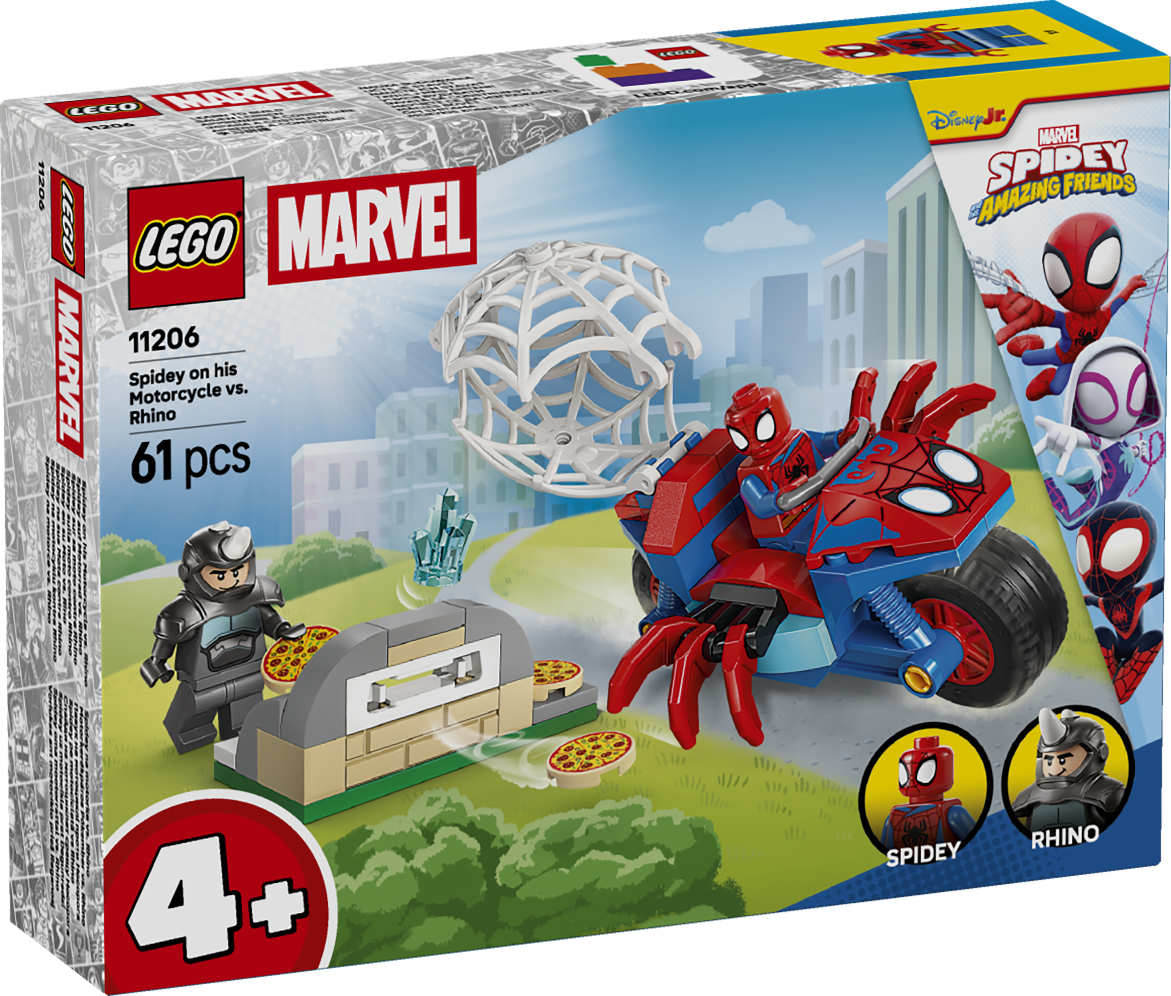 Bērni palīdz Spidey atgūt nozagto, zilo dārgakmeni, izvairīties no lidojošajām picām, ko Degunradzis raida ar picu šāvēju, un sagūstīt Degunradzi milzu zirnekļtīklā – kas arī der uz motocikla. Šis būvēšanas komplekts ir izstrādāts, padomājot par mazajiem būvētājiem, un tajā ir daudz detaļu, kas rosinās nebeidzamas, radošas rotaļas. Tā ir lieliska dāvana dzimšanas dienā vai jebkurā citā notikumā seriāla Spidey And His Amazing Friends faniem. Komplektā ir krāsainas instrukcijas attēlu formā, liels Sākuma klucītis un atsevišķas paciņas ar vienu būvējamo modeli katrā, ar ko būvēšanu padarīt ātru un aizraujošu. Lietotnē LEGO® Builder bērni var tuvināt, grozīt modeļus trīs dimensijās un sekot līdzi savam progresam ar viegli izpildāmām digitālām instrukcijām. Komplektā ir 61 detaļa.