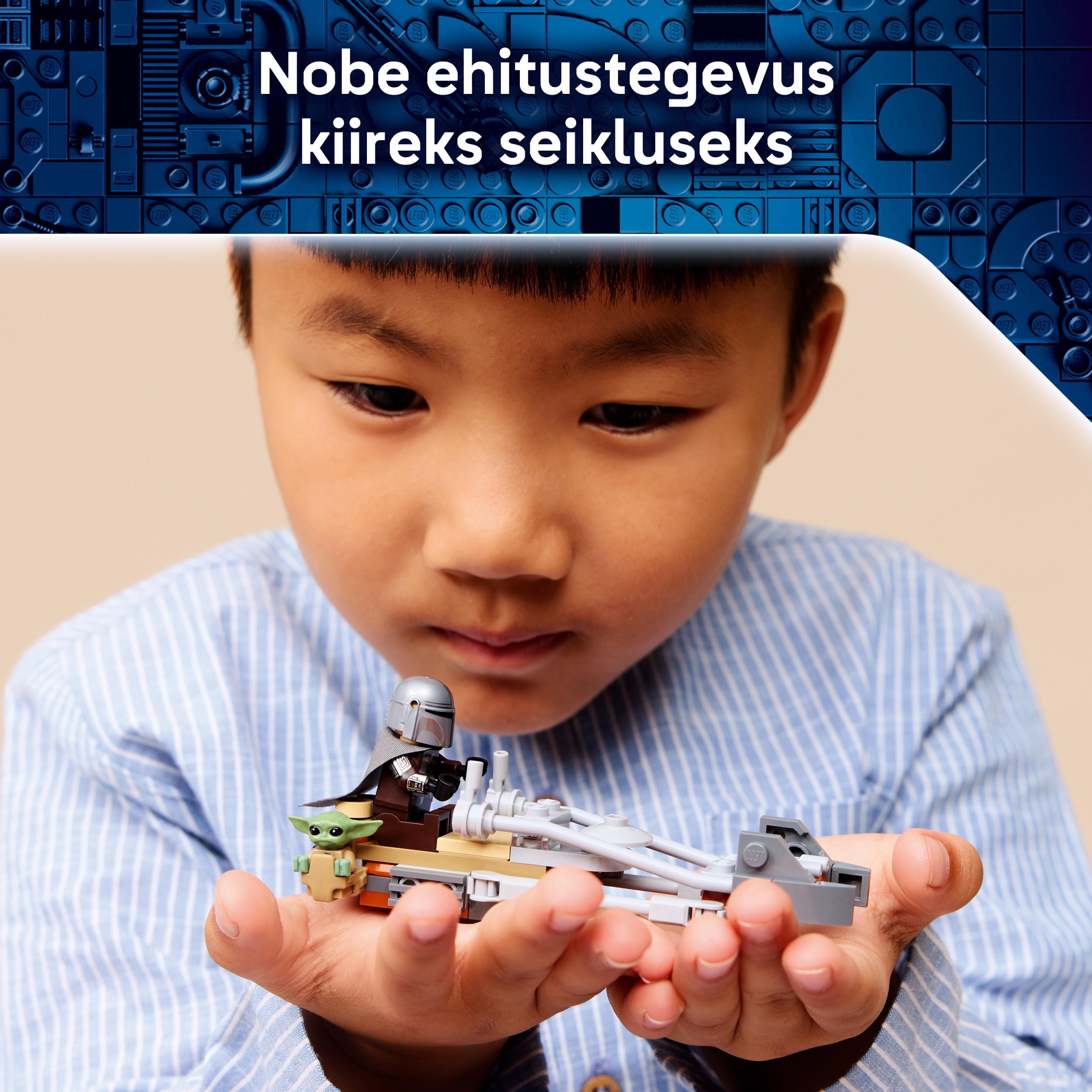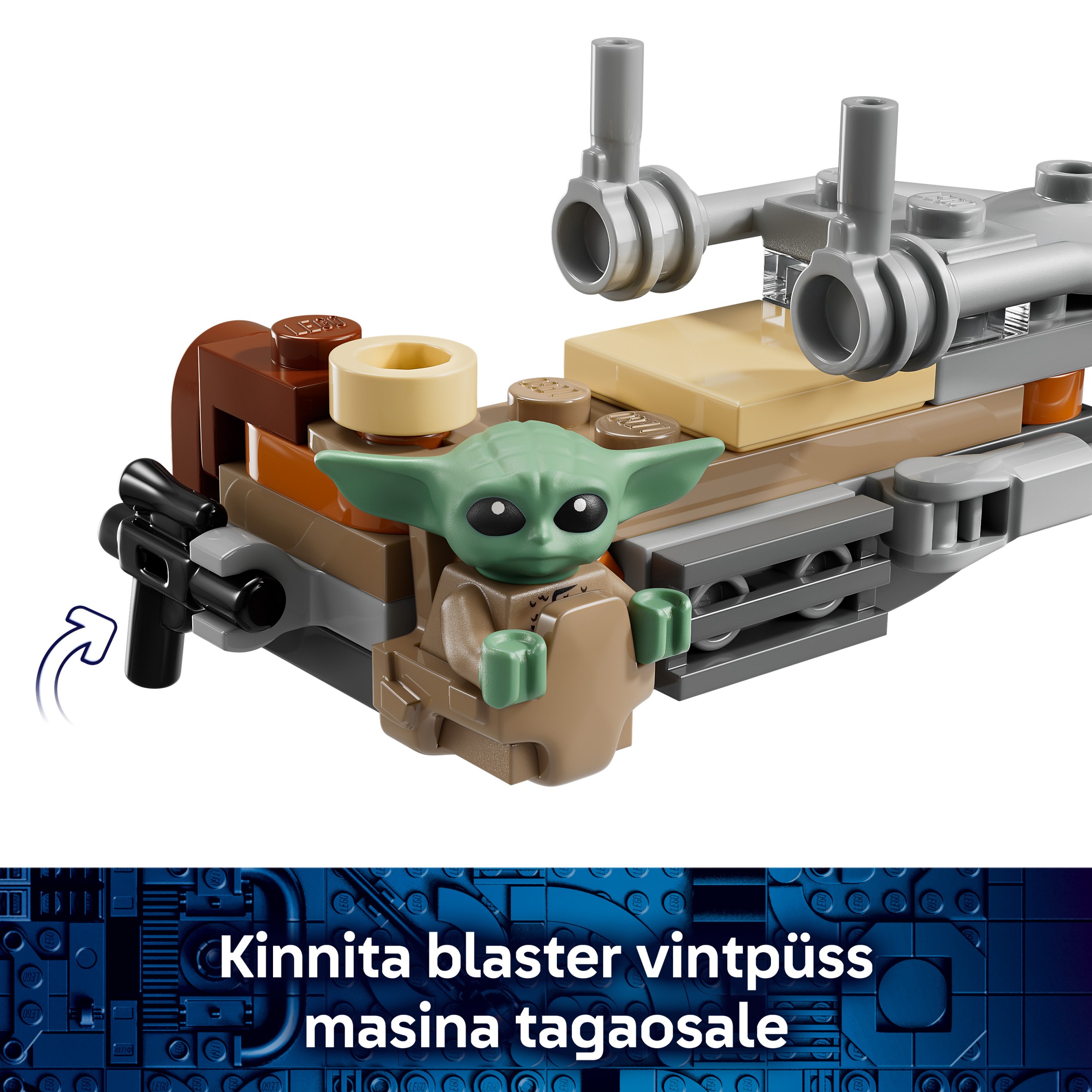 - ĀTRGAITAS MOTOCIKLS. Piestiprini Mandalorian šauteni ātrgaitas motocikla aizmugurē un ievieto viņu vadītāja sēdeklī, un Grogu – piestiprinātajā somā