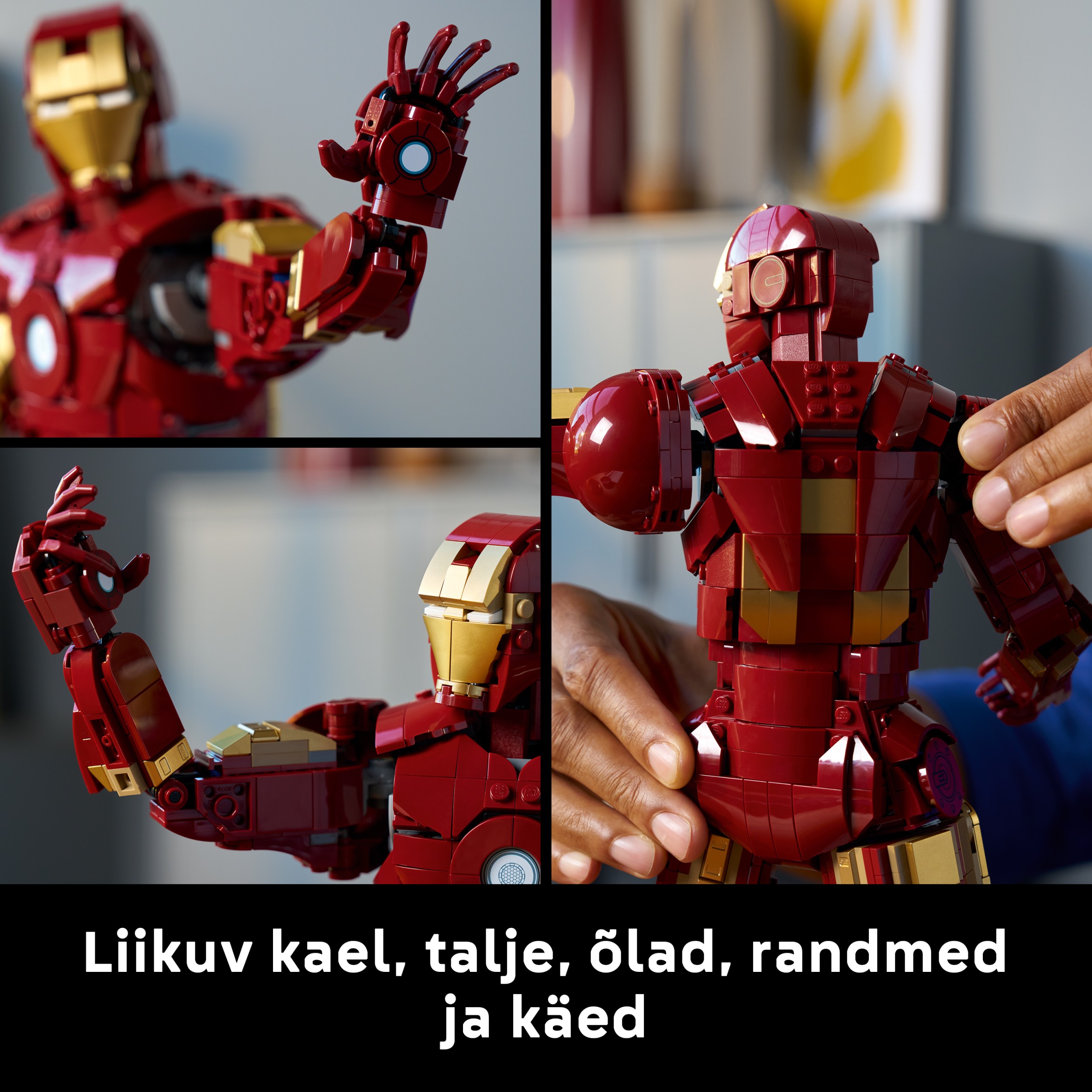 Izliec apskatei autentiski detalizētās Dzelzs vīra bruņas dinamiskās pozās, mainot kakla, vidukļa, plecu, plaukstu locītavu un plaukstu novietojumu. LEGO ǀ Marvel figūru rotā zeltaini akcenti, un tā ir novietota uz izturīgas pamatnes ar nosaukuma plāksnīti, veidojot izteiksmīgu dekoru par supervaroņu tematiku. Kā papildu dāvana ir iekļauta arī Dzelzs vīra minifigūra, kas ir gatava piedzīvojumiem Mark 3 bruņās. Būvētāji var lejupielādēt lietotni LEGO® Builder, lai gūtu kopīgas būvēšanas pieredzi režīmā "Build Together" kopā ar draugiem un ģimeni. Būvēšanas komplektā ir 1297 detaļas.