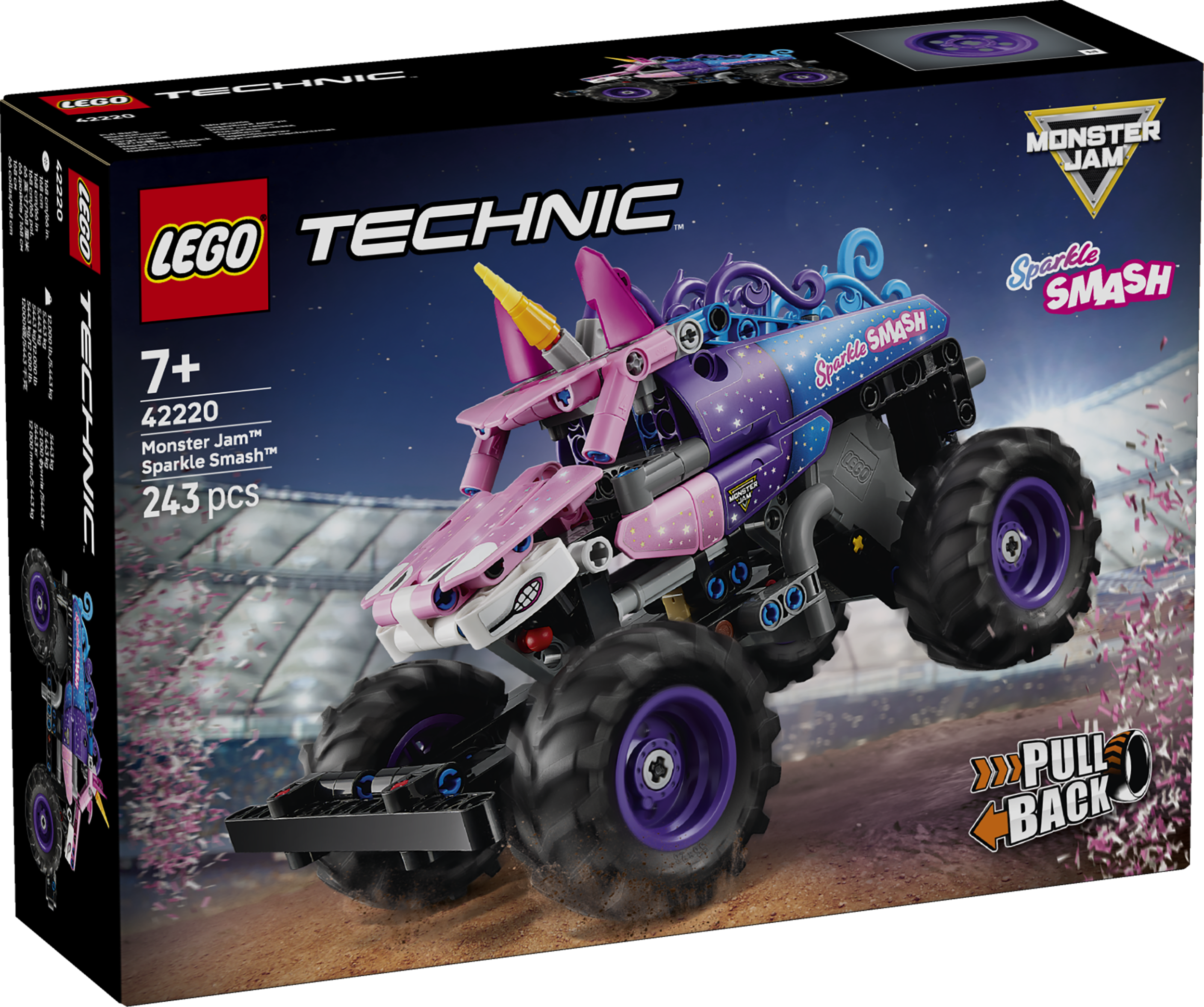- MONSTER JAM™ BŪVĒŠANAS ROTAĻLIETA. Šis LEGO® Technic Monster Jam Sparkle Smash™ atvelkamais auto (42220) piedāvā stundām ilgas rotaļas zēniem un meitenēm no 7 gadu vecuma, kam patīk kravas auto un rotaļu vienradži
