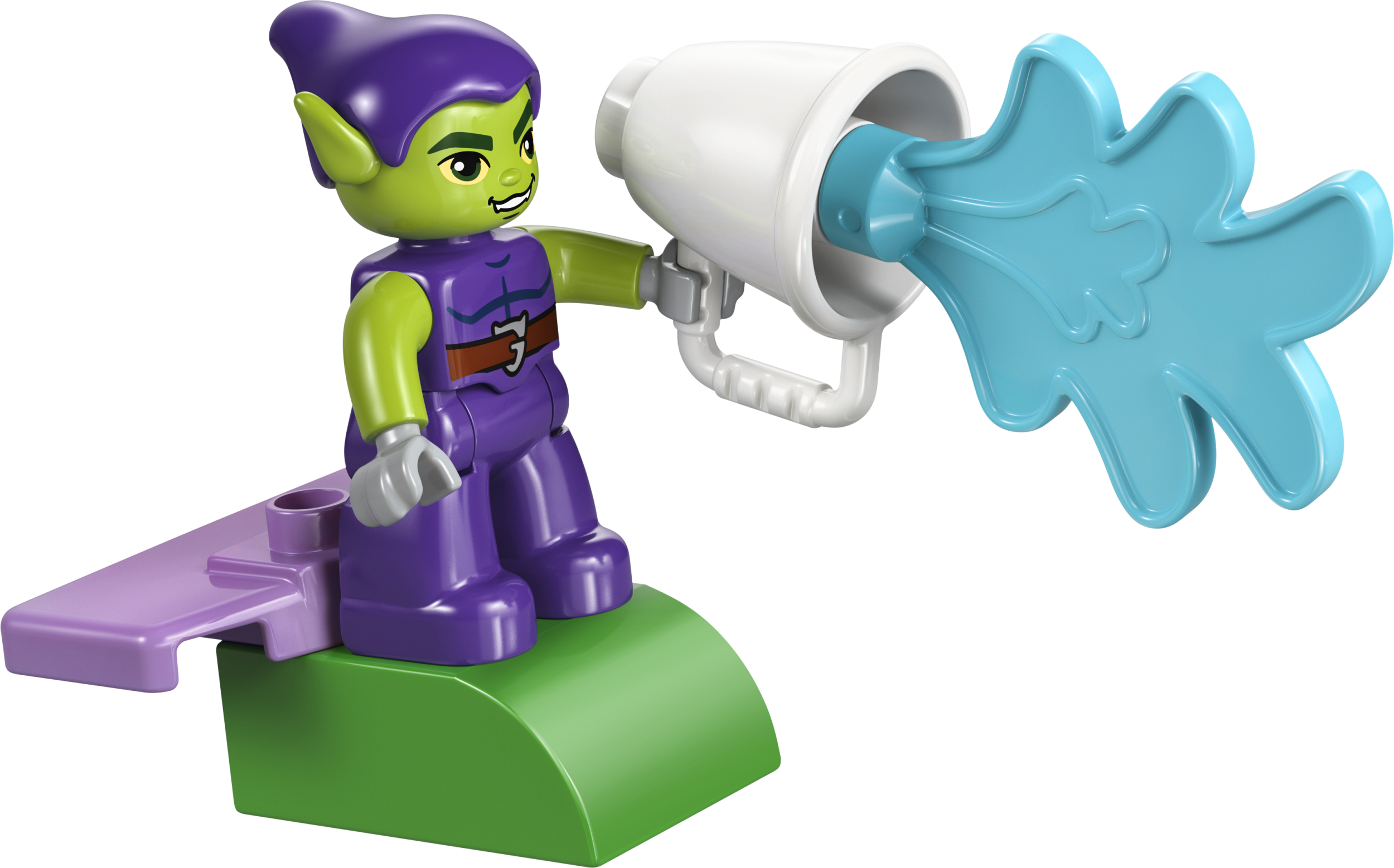 - МНОЖЕСТВО ФУНКЦИЙ — в наборе есть фигурка Спайди-рекса LEGO® DUPLO® с открывающейся и закрывающейся пастью, фигурка Зеленого гоблина на флаере и с водяной пушкой, камера с сокровищами и арка