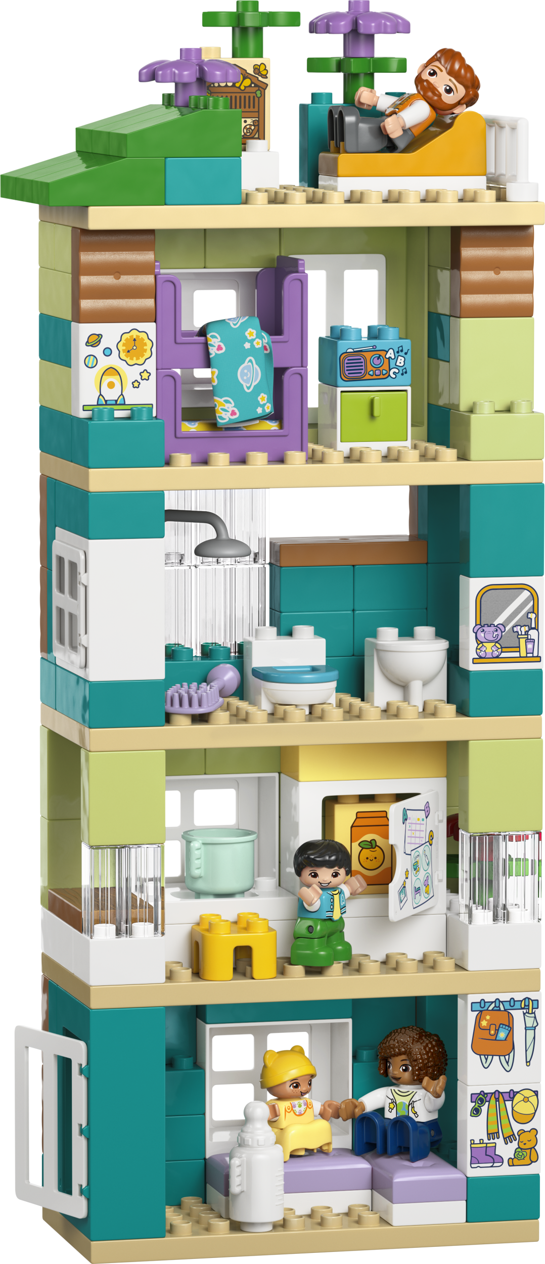Универсальная игрушка для развития мелкой моторики открывает множество творческих возможностей, предлагая самым юным девочкам и мальчикам собрать три модели из одного набора кубиков LEGO® DUPLO®. Они могут собрать его как квартиру на одном этаже или как трех- или пятиэтажный кукольный домик с садом на крыше и такими аксессуарами, как шезлонг и отель для насекомых.