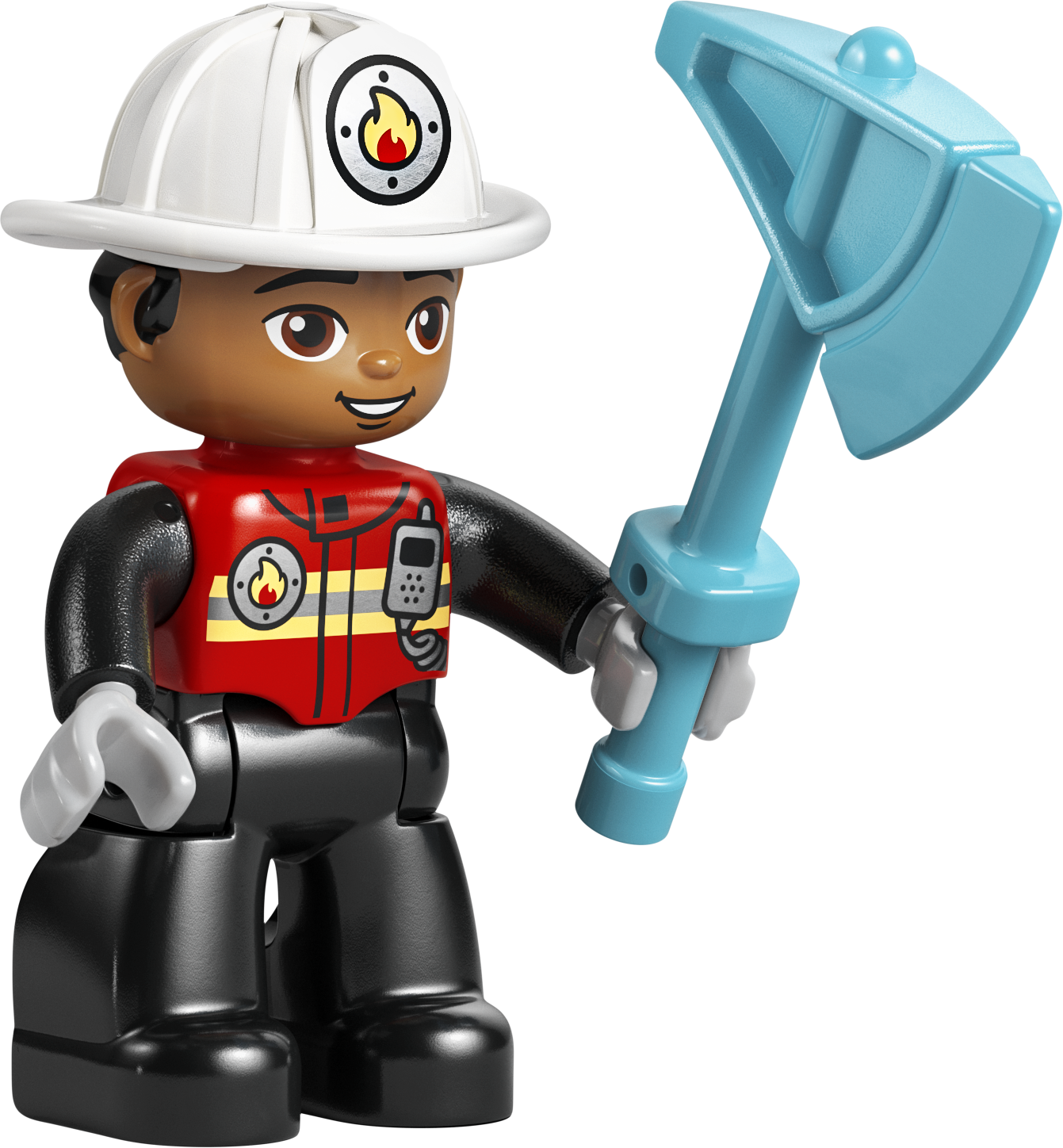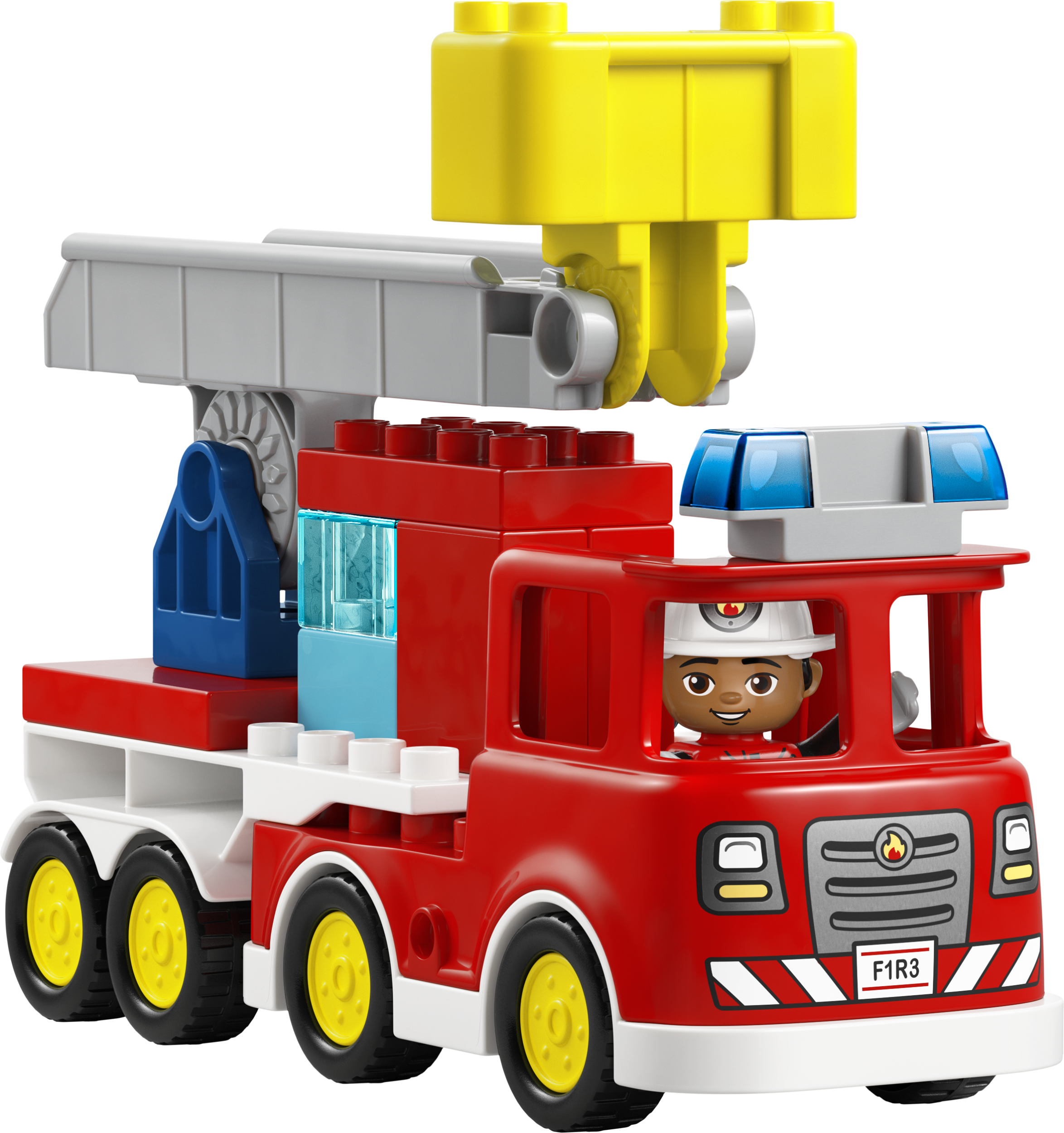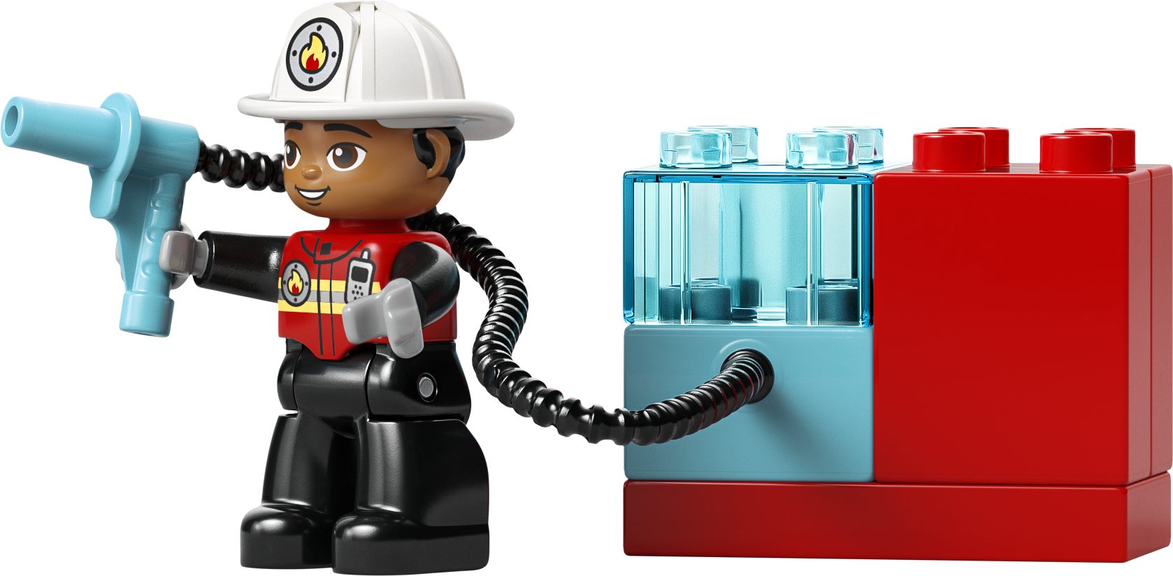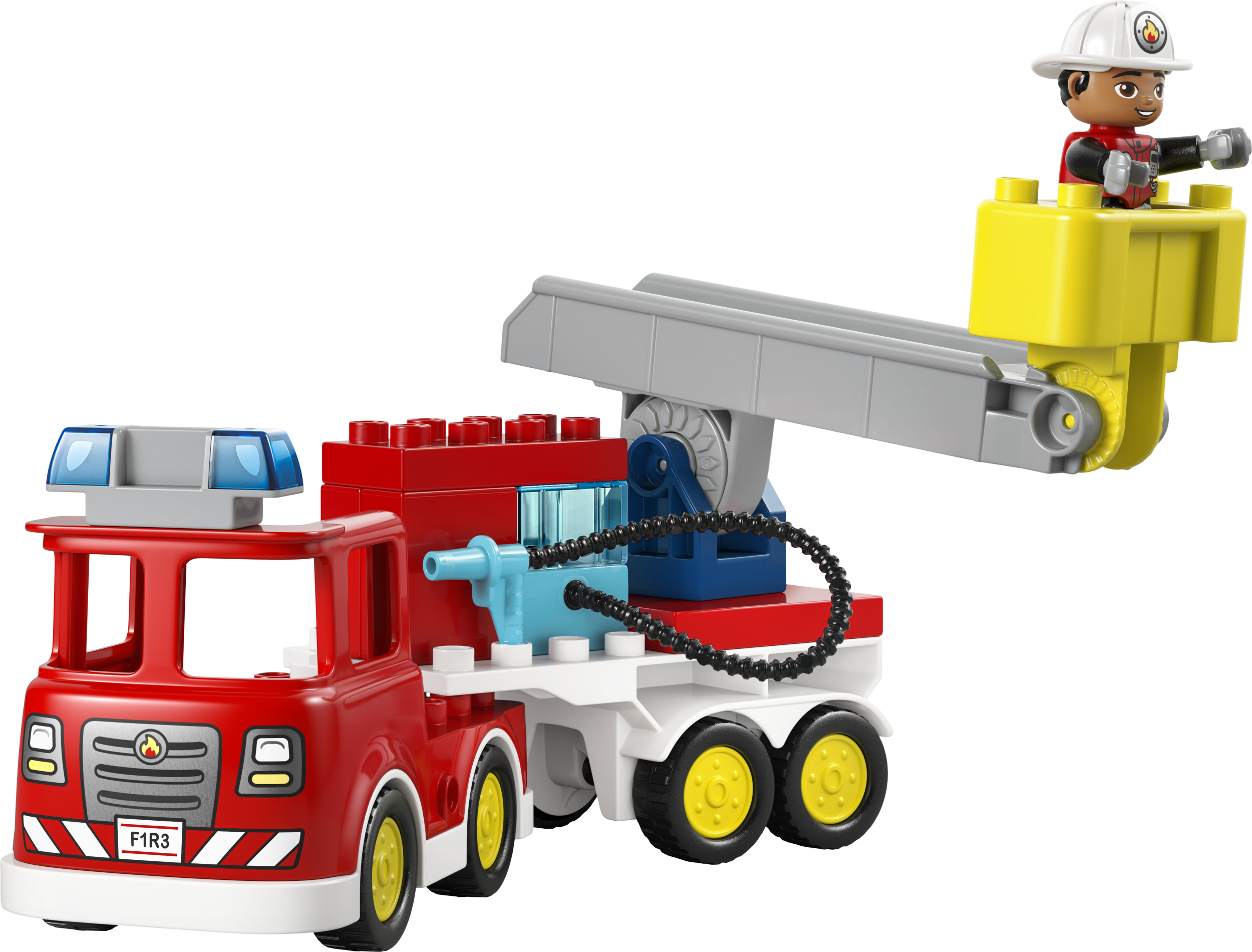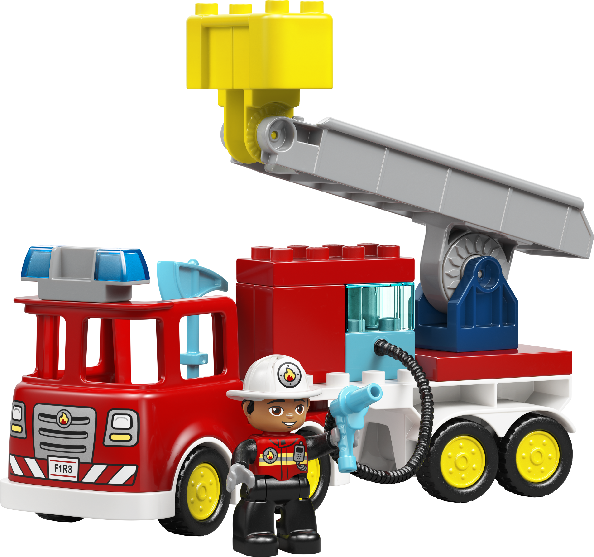 - ИГРУШКА С ПОЖАРНЫМ LEGO® DUPLO® — эта творческая игрушка позволяет малышам представить себя в роли повседневных героев, использующих лестницу, чтобы потушить при помощи шланга горящее бревно, пока белка смотрит на эти приключения издалека.