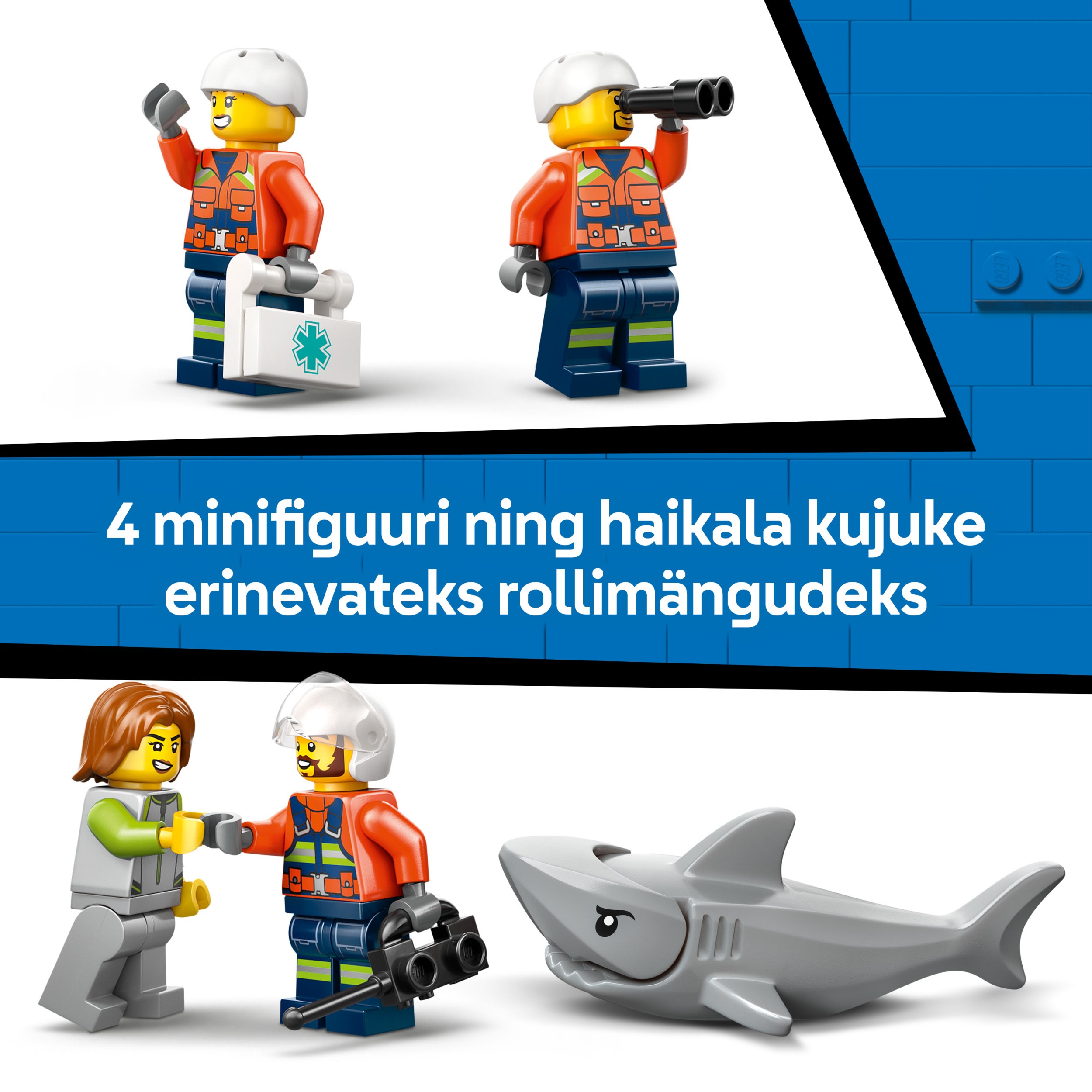 - ЧТО В КОРОБКЕ — в наборе есть необходимое для создания детальной игрушечной модели морского спасательного вертолета, спасательной капсулы, а также минифигурки пилота, пострадавшего и двух сотрудников береговой охраны и фигурка акулы
