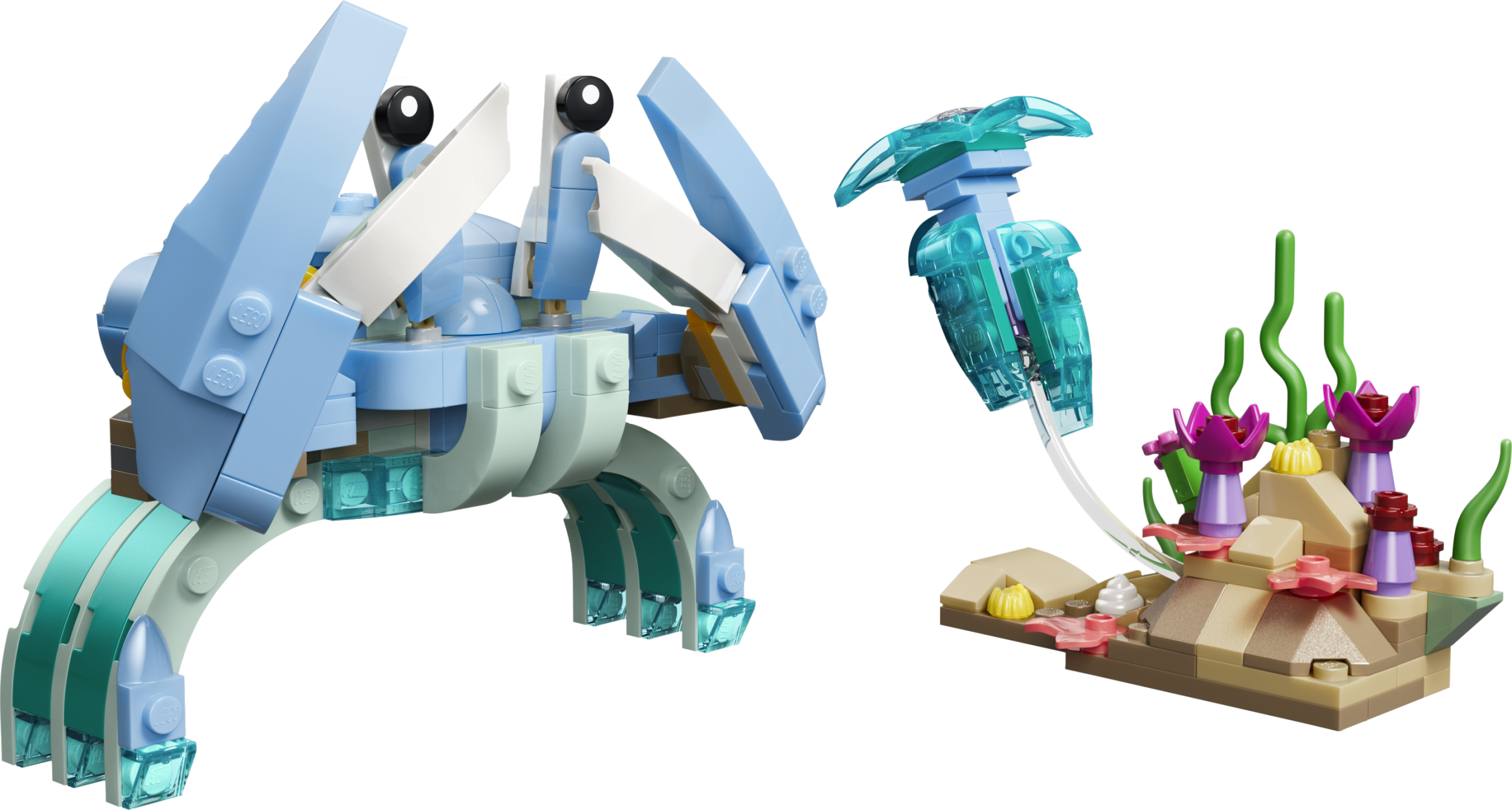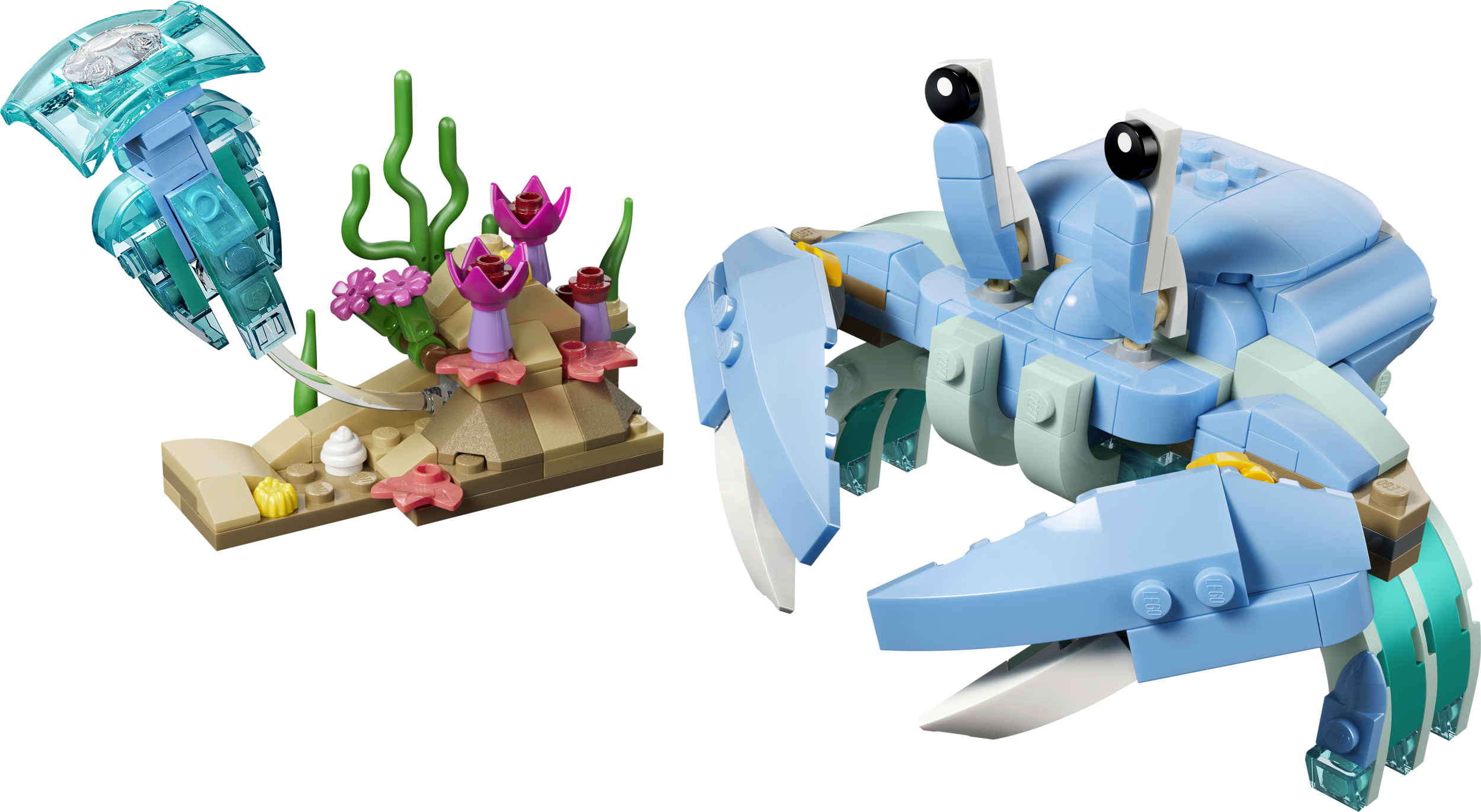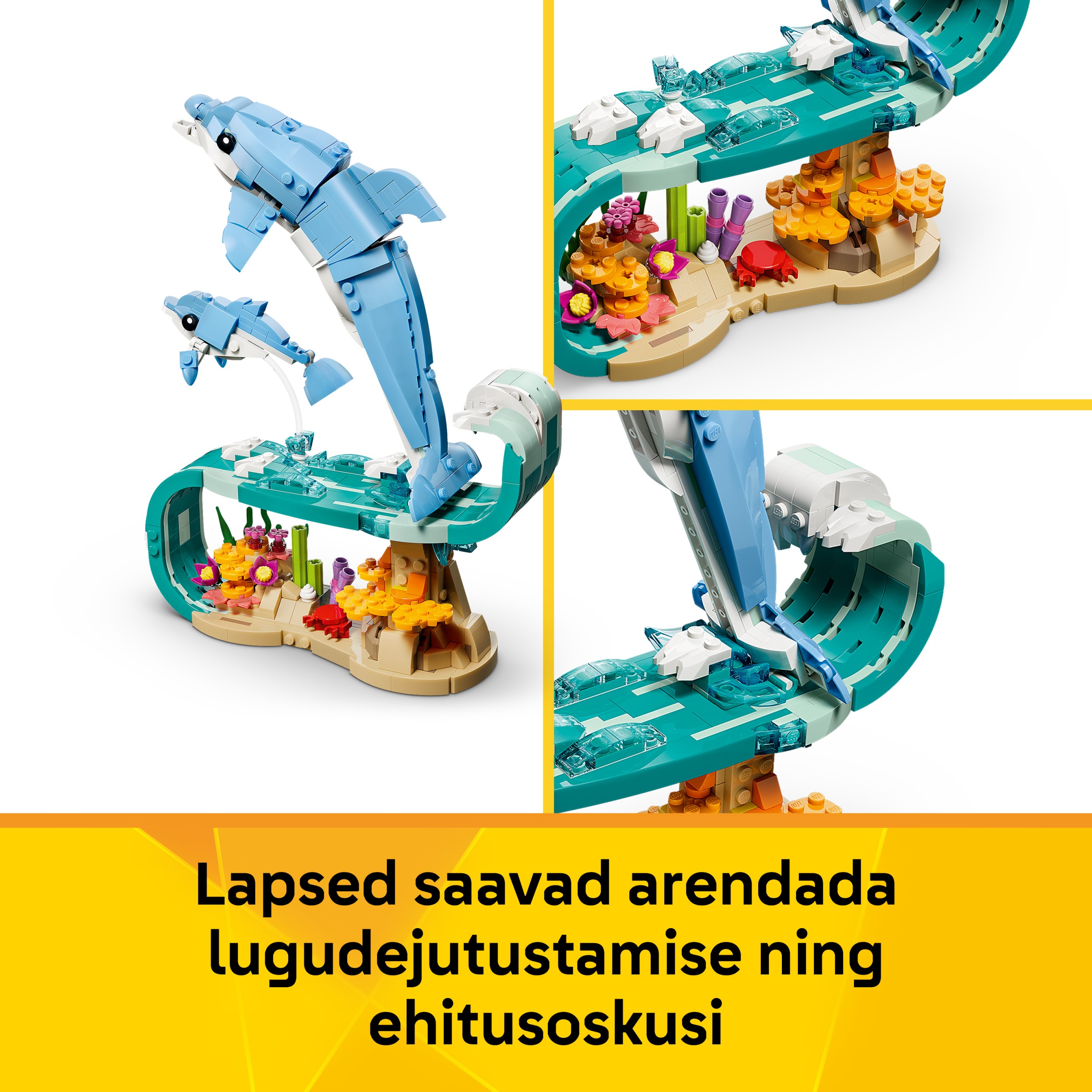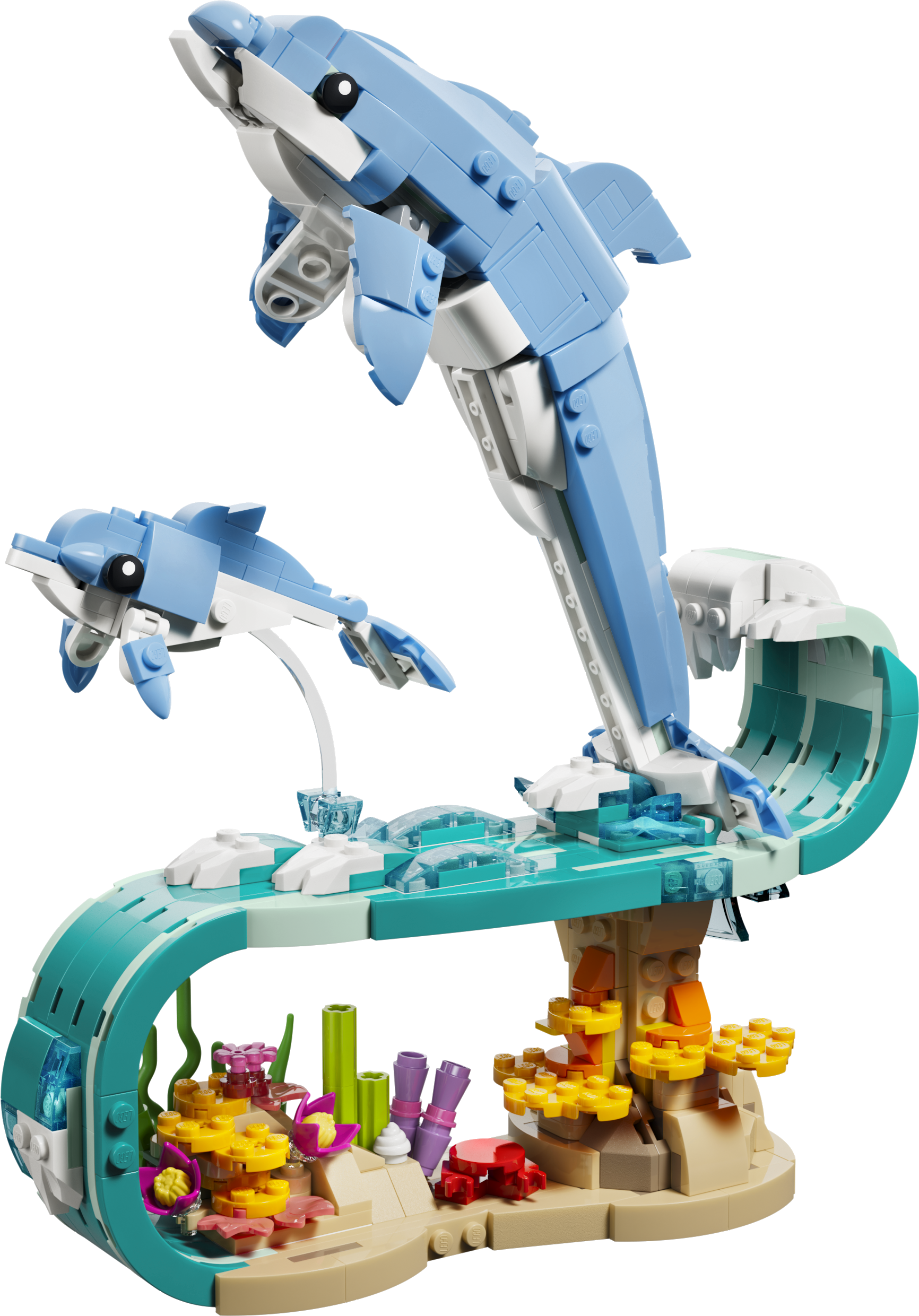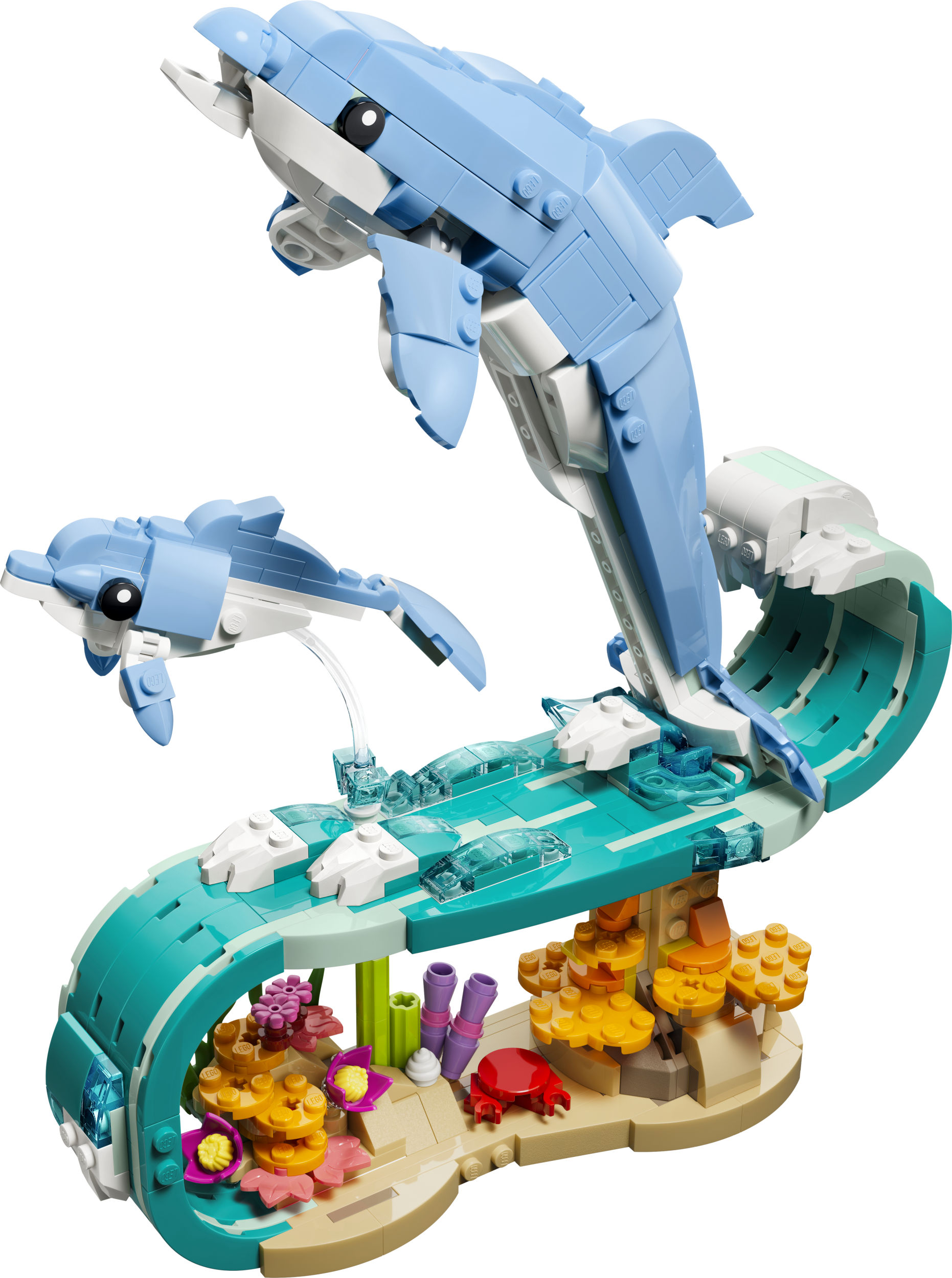 - БЕСКОНЕЧНЫЕ ВАРИАНТЫ ТВОРЧЕСКОЙ ИГРЫ — дети могут наслаждаться увлекательными историями с тремя милыми моделями с животными (модели нельзя собрать одновременно): двумя игрушечными дельфинами, резвящимися на волне, морским коньком или крабом.