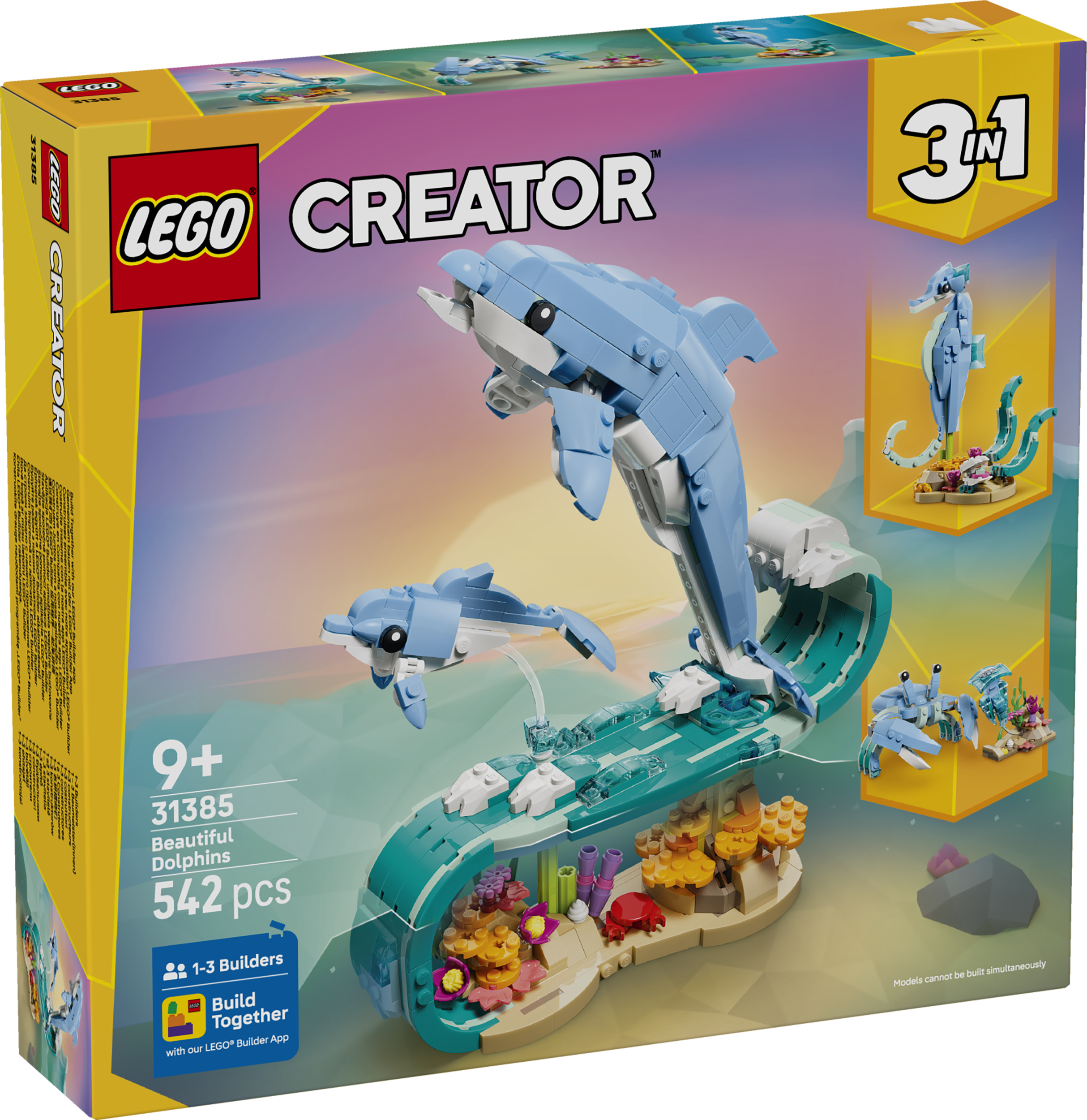 - ФИГУРКИ ЖИВОТНЫХ 3 в 1» — игрушка для сборки «Морские животные: красивые дельфины» LEGO® Creator «3 в 1» (31385) позволяет девочкам, мальчикам и детям в возрасте от 9 лет собрать и перестраивать трех морских животных из одних и тех же кубиков.