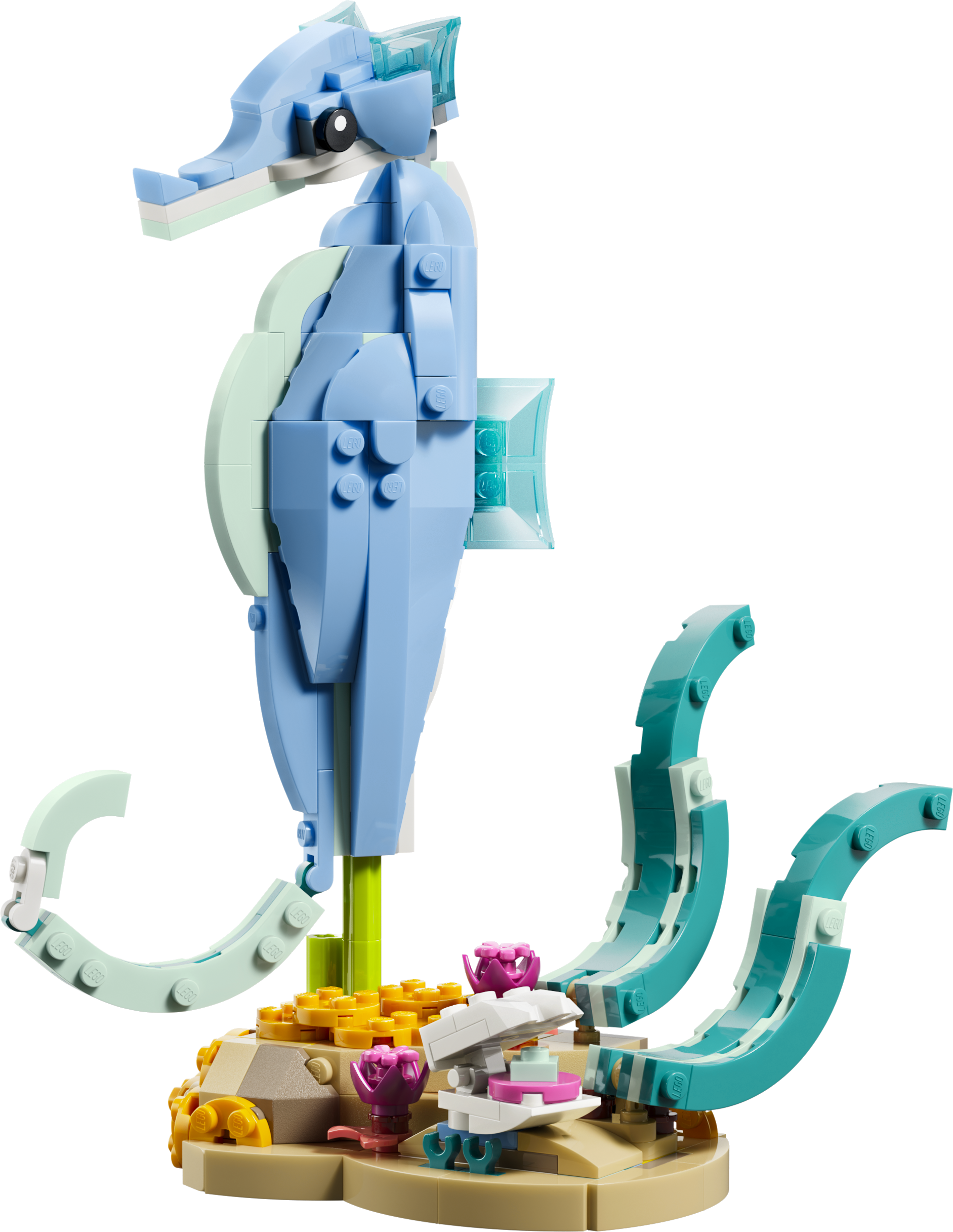 - АКСЕССУАРЫ ДЛЯ ИГРЫ И ДЕМОНСТРАЦИИ — дельфины скользят на волне с кораллом, морской конек стоит на подставке с водорослями и подвижной ракушкой, а краб — рядом с медузой и морскими растениями.