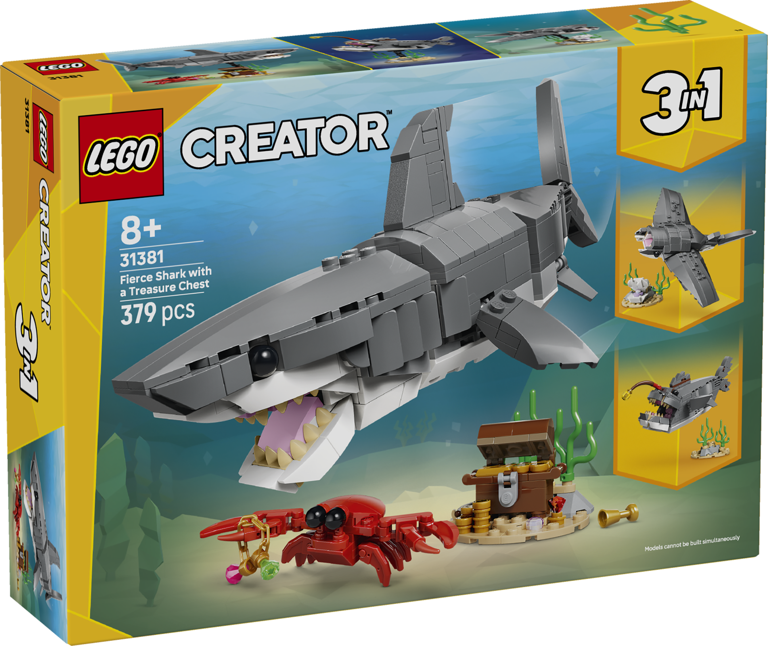 - МОРСКИЕ ЖИВОТНЫЕ «3 в 1» — набор «Злобная акула и сундук с сокровищами» LEGO® Creator «3 в 1» (31381) позволяет мальчикам и девочкам в возрасте от 8 лет собирать и перестраивать три фигурки морских животных из одних и тех же кубиков.