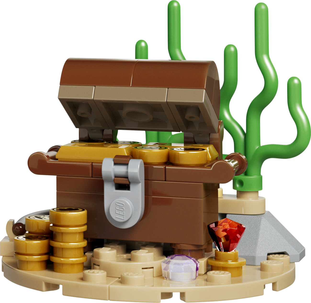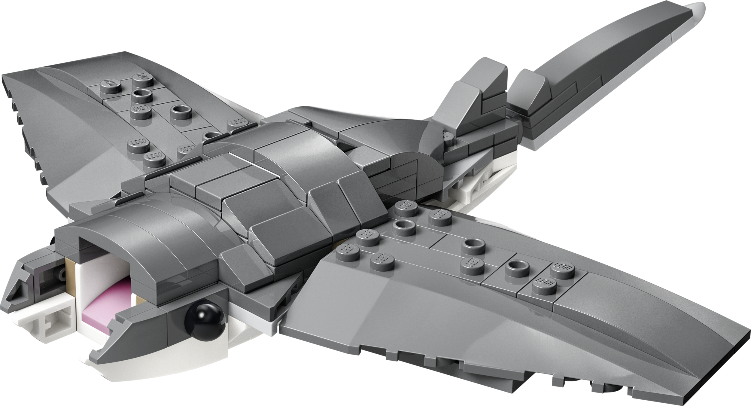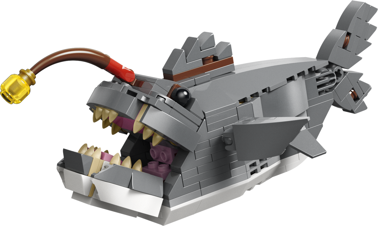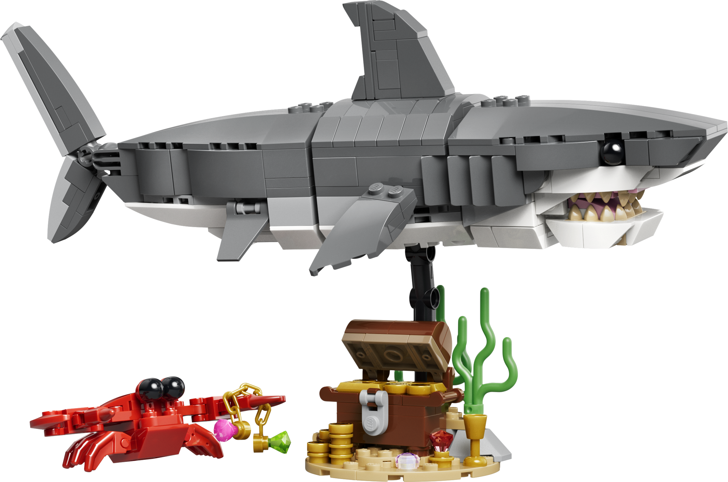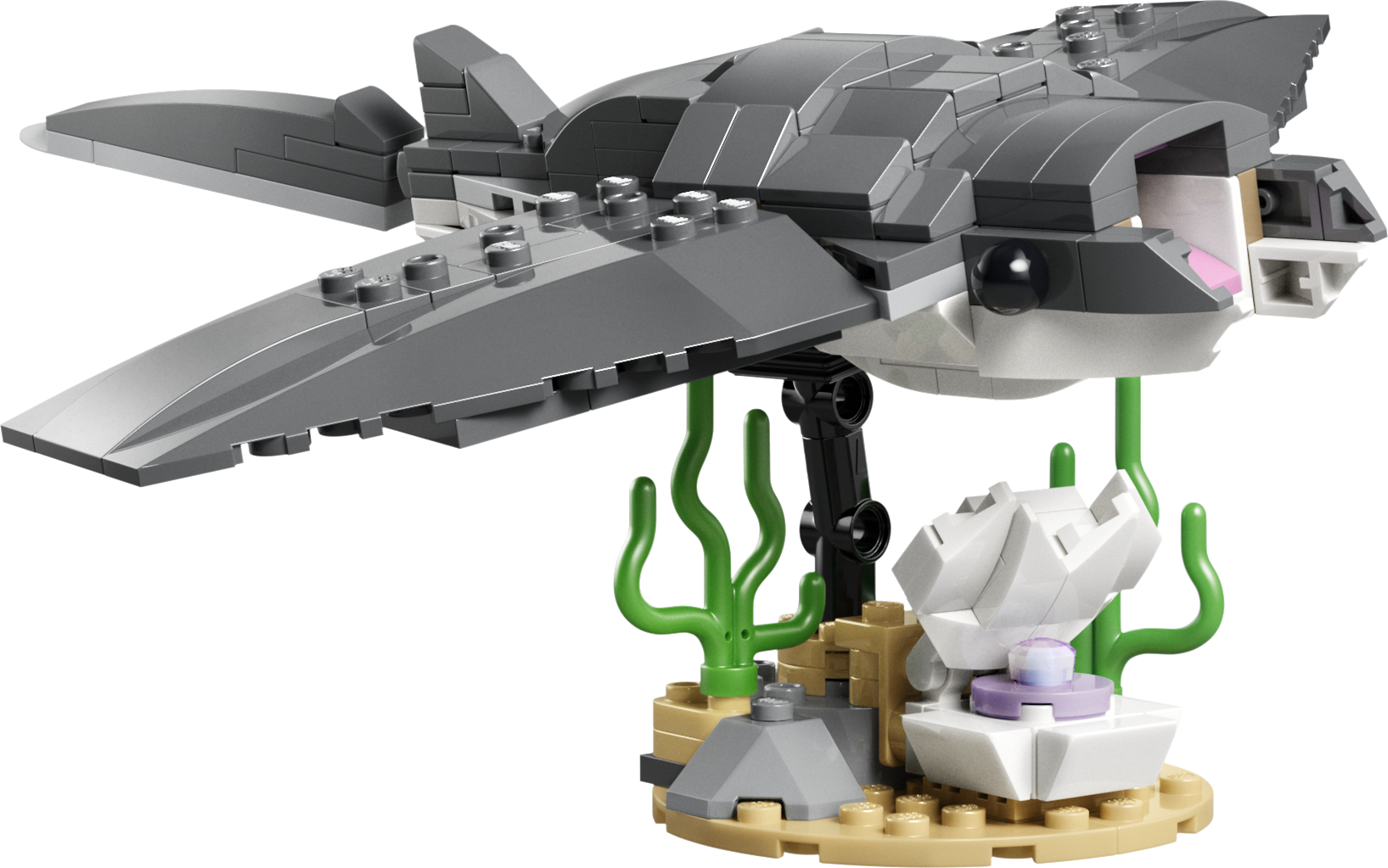 - БЕСКОНЕЧНЫЕ ВАРИАНТЫ ТВОРЧЕСКОЙ ИГРЫ — дети могут наслаждаться увлекательными историями с тремя игрушечными морскими существами (модели нельзя собрать одновременно): игрушечной акулой с сундуком с сокровищами, рыбой-удильщиком или скатом манта.