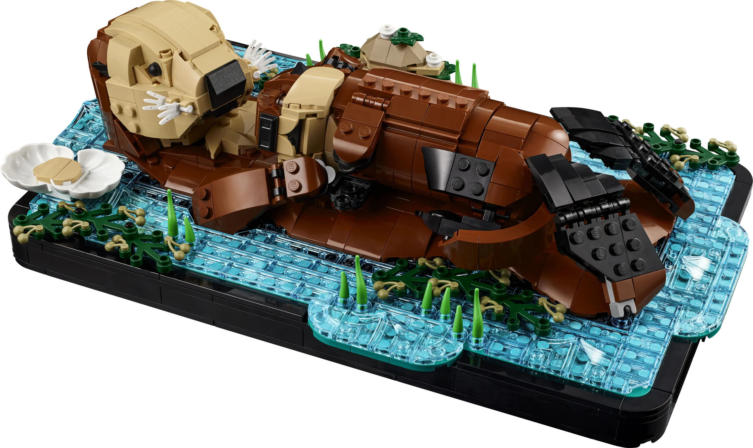 - СОЗДАЙТЕ СВОЮ ВЕРСИЮ — Поверните голову, рот, лапы и ласты мамы-калана и положите ей на живот детеныша или положите рядом собранную из кубиков ракушку.