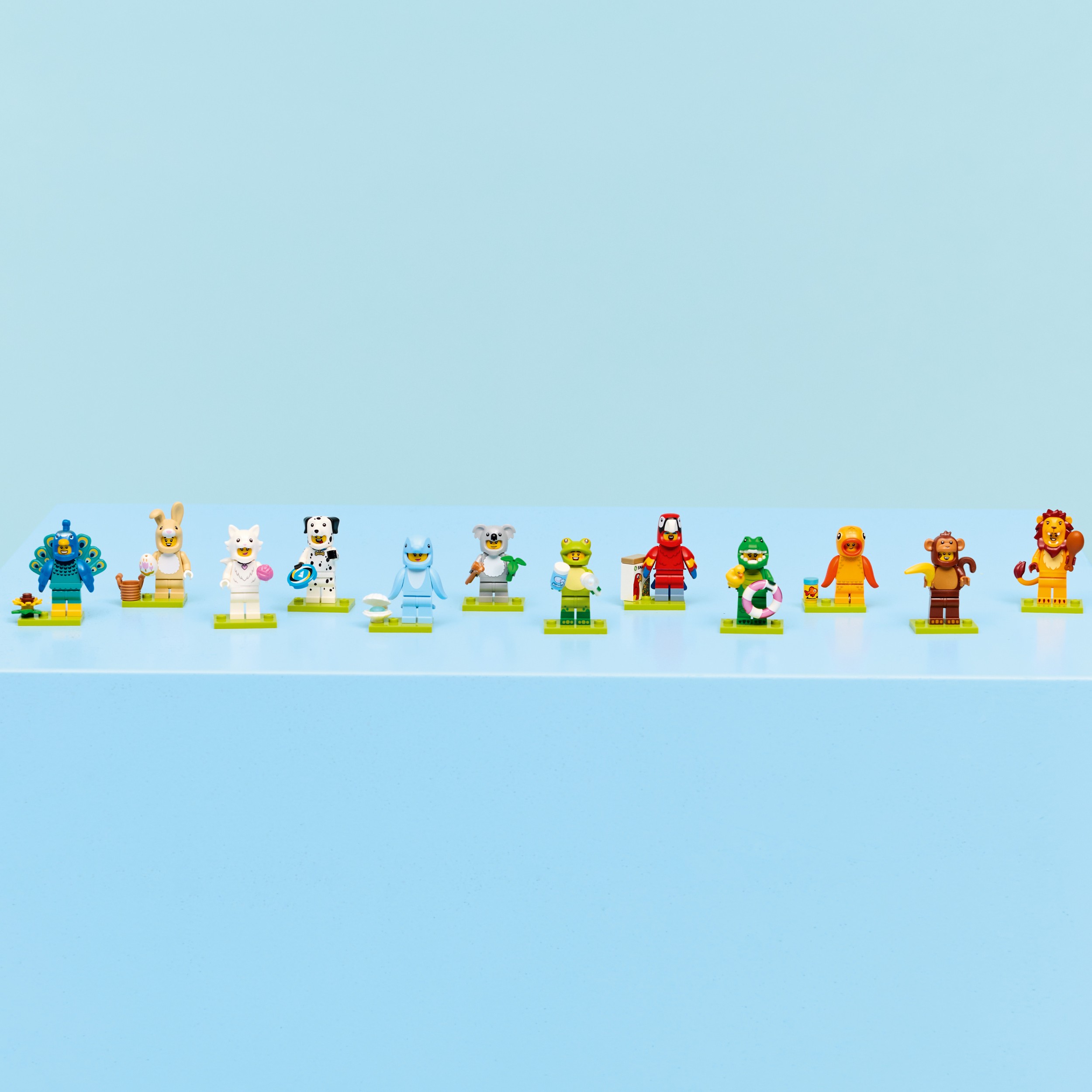 В каждой коробке есть одна случайно выбранная минифигурка LEGO из 12 коллекционных персонажей: фигурок в костюмах попугая, льва, лягушки, крокодила, далматинца, золотой рыбки, милого кролика, павлина, пушистого кота, коалы, дельфина и обезьяны. Каждая из 12 минифигурок поставляется в запечатанной таинственной коробке, и с каждой вы получаете как минимум один аксессуар.